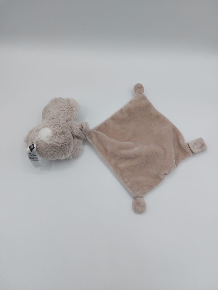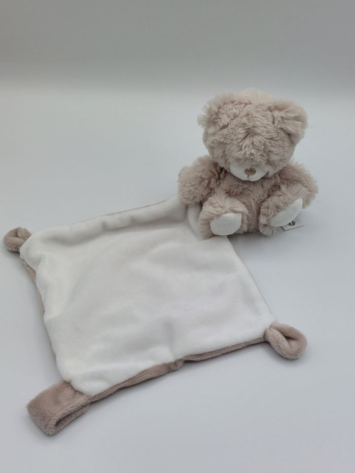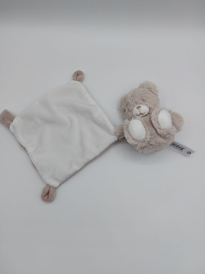 Doudou peluche ours fourrure marron beige 1TEX Baby mouchoir marron blanc attache tétine - photo numéro 1