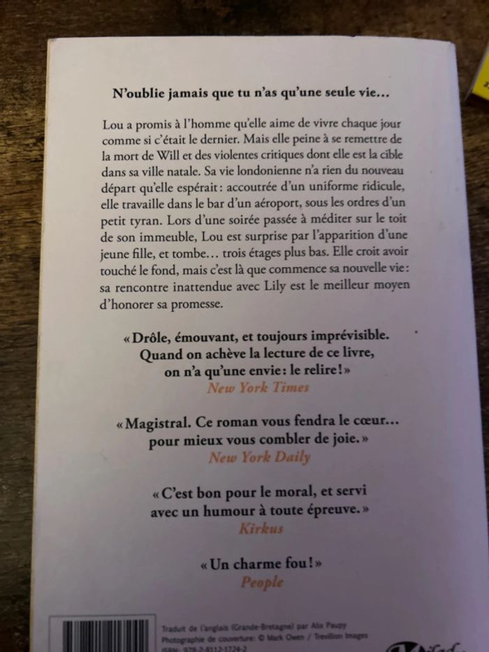 N'oublie jamais que tu n'as qu'une seule vie... Lou a promis à l'homme qu'elle aime de vivre chaque jour comme si c'était le dernier. Mais elle peine à se remettre de la mort de Will et des violentes critiques dont elle est la cible dans sa ville natale. Sa vie londonienne n'a rien du nouveau départ qu'elle espérait: accoutrée d'un uniforme ridicule, elle travaille dans le bar d'un aéroport, sous les ordres d'un petit tyran. Lors d'une soirée passée à méditer sur le toit de son immeuble, Lou est surprise par l'apparition d'une jeune fille, et tombe... trois étages plus bas. Elle croit avoir touché le fond, mais c'est là que commence sa nouvelle vie: sa rencontre inattendue avec Lily est le meilleur moyen d'honorer sa promesse.