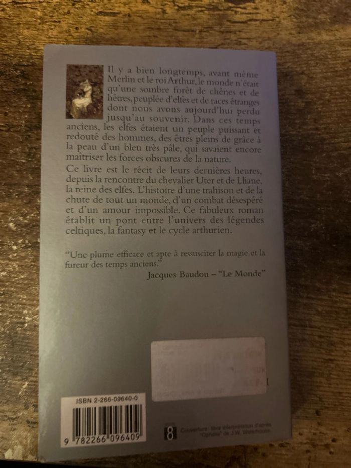 Il y a bien longtemps, avant même Merlin et le roi Arthur, le monde n'était qu'une sombre forêt de chênes et de hêtres, peuplée d'elfes et de races étranges dont nous avons aujourd'hui perdu jusqu'au souvenir. Dans ces temps anciens, les elfes étaient un peuple puissant et redouté des hommes, des êtres pleins de grâce à la peau d'un bleu très pâle, qui savaient encore maîtriser les forces obscures de la nature. Ce livre est le récit de leurs dernières heures, depuis la rencontre du chevalier Uter et de Lliane, la reine des elfes. L'histoire d'une trahison et de la chute de tout un monde, d'un combat désespéré et d'un amour impossible. Ce fabuleux roman établit un pont entre l'univers des légendes celtiques, la fantasy et le cycle arthurien.