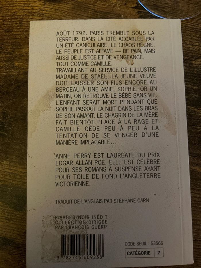 AOÛT 1792. PARIS TREMBLE SOUS LA TERREUR. DANS LA CITÉ ACCABLÉE PAR UN ÉTÉ CANICULAIRE, LE CHAOS RÈGNE. LE PEUPLE EST AFFAMÉ - DE PAIN, MAIS AUSSI DE JUSTICE ET DE VENGEANCE. TOUT COMME CAMILLE. TRAVAILLANT AU SERVICE DE L'ILLUSTRE MADAME DE STAËL, LA JEUNE VEUVE DOIT LAISSER SON FILS ENCORE AU BERCEAU À UNE AMIE, SOPHIE. OR UN MATIN, ON RETROUVE LE BÉBÉ SANS VIE. L'ENFANT SERAIT MORT PENDANT QUE SOPHIE PASSAIT LA NUIT DANS LES BRAS DE SON AMANT. LE CHAGRIN DE LA MÈRE FAIT BIENTOT PLACE À LA RAGE ET CAMILLE CEDE PEU À PEU À LA TENTATION DE SE VENGER D'UNE MANIERE IMPLACABLE...