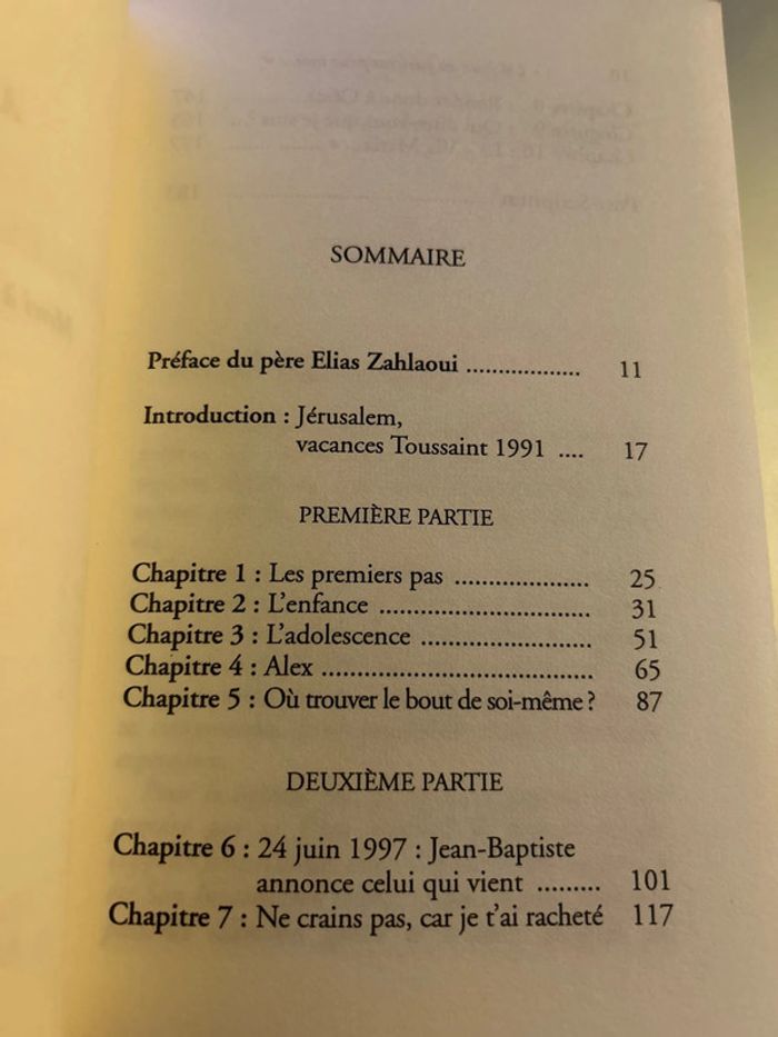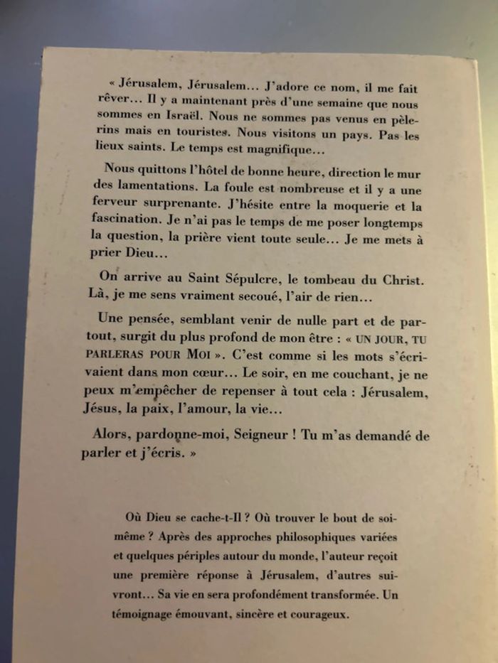 « Jérusalem, Jérusalem... J'adore ce nom, il me fait rêver... Il y a maintenant près d'une semaine que nous sommes en Israël. Nous ne sommes pas venus en pèlerins mais en touristes. Nous visitons un pays. Pas les lieux saints. Le temps est magnifique... Nous quittons l'hôtel de bonne heure, direction le mur des lamentations. La foule est nombreuse et il y a une ferveur surprenante. J'hésite entre la moquerie et la fascination. Je n'ai pas le temps de me poser longtemps la question, la prière vient toute seule... Je me mets à prier Dieu... On arrive au Saint Sépulere, le tombeau du Christ. Là, je me sens vraiment secoué, l'air de rien... Une pensée, semblant venir de nulle part et de par-tout, surgit du plus profond de mon être : « UN JOUR, TU PARLERAS POUR Mol ». C'est comme si les mots s'écrivaient dans mon cœur... Le soir, en me couchant, je ne peux m'empêcher de repenser à tout cela : Jérusalem, Jésus, la paix, l'amour, la vie... mana moi Scioneur ! Tu m'as demandé de