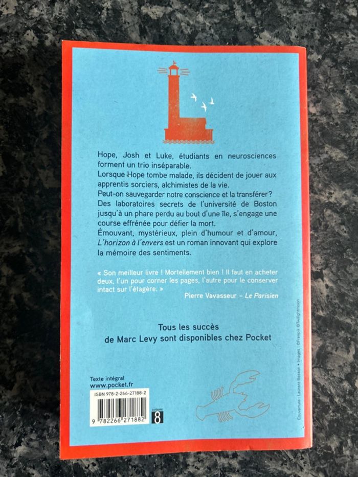 Hope, Josh et Luke, étudiants en neurosciences forment un trio inséparable. Lorsque Hope tombe malade, ils décident de jouer aux apprentis sorciers, alchimistes de la vie. Peut-on sauvegarder notre conscience et la transférer? Des laboratoires secrets de l'université de Boston jusqu'à un phare perdu au bout d'une île, s'engage une course effrénée pour défier la mort. Émouvant, mystérieux, plein d'humour et d'amour, L'horizon à l'envers est un roman innovant qui explore la mémoire des sentiments.