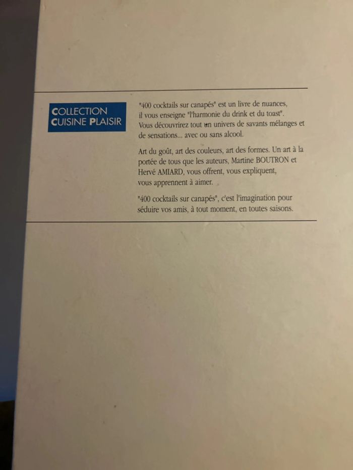 "400 cocktails sur canapés" est un livre de nuances, il vous enseigne "'harmonie du drink et du toast". Vous découvrirez tout un univers de savants mélanges et de sensations... avec ou sans alcool. Art du goût, art des couleurs, art des formes. Un art à la portée de tous que les auteurs, Martine BOUTRON et Hervé AMIARD, vous offrent, vous expliquent, vous apprennent à aimer. "400 cocktails sur canapés", c'est l'imagination pour séduire vos amis, à tout moment, en toutes saisons.
