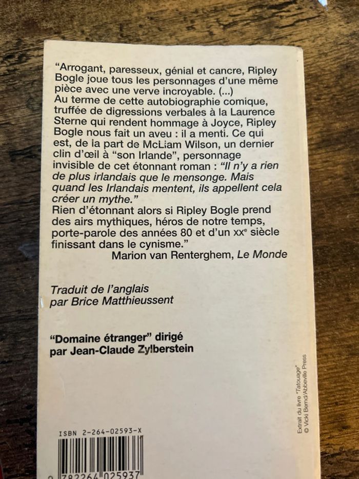 "Arrogant, paresseux, génial et cancre, Ripley Bogle joue tous les personnages d'une même pièce avec une verve incroyable. (...) Au terme de cette autobiographie comique, truffée de digressions verbales à la Laurence Sterne qui rendent hommage à Joyce, Ripley Bogle nous fait un aveu : il a menti. Ce qui est, de la part de McLiam Wilson, un dernier clin d'œil à "son Irlande", personnage invisible de cet étonnant roman : "Il n'y a rien de plus irlandais que le mensonge. Mais quand les Irlandais mentent, ils appellent cela créer un mythe." Rien d'étonnant alors si Ripley Bogle prend des airs mythiques, héros de notre temps, porte-parole des années 80 et d'un xx° siècle finissant dans le cynisme.