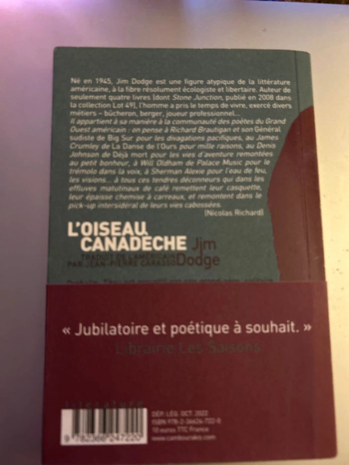 Né en 1945, Jim Dodge est une figure atypique de la littérature américaine, à la fibre résolument écologiste et libertaire. Auteur de seulement quatre livres (dont Stone Junction, publié en 2008 dans la collection Lot 49), l'homme a pris le temps de vivre, exercé divers métiers - bûcheron, berger, joueur professionnel... Il appartient à sa manière à la communauté des poètes du Grand Ouest américain : on pense à Richard Brautigan et son Général sudiste de Big Sur pour les divagations pacifiques, au James Crumley de La Danse de l'Ours pour mille raisons, au Denis Johnson de Déjà mort pour les vies d'aventure remontées au petit bonheur, à Will Oldham de Palace Music pour le trémolo dans la voix, à Sherman Alexie pour l'eau de feu, les visions... à tous ces tendres déconneurs qui dans les effluves matutinaux de café remettent leur casquette, leur épaisse chemise à carreaux, et remontent dans le pick-up intersidéral de leurs vies cabossées.