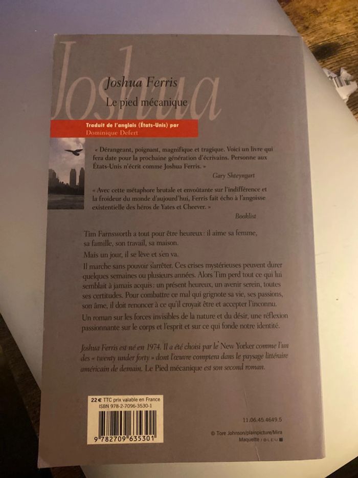 Tim Farnsworth a tout pour être heureux: il aime sa femme, sa famille, son travail, sa maison. Mais un jour, il se lève et sen va. Il marche sans pouvoir sarrêter. Ces crises mystérieuses peuvent durer quelques semaines ou plusieurs années. Alors Tim perd tout ce qui lui semblait à jamais acquis: un présent heureux, un avenir serein, toutes ses certitudes. Pour combattre ce mal qui grignote sa vie, ses passions, son âme, il doit renoncer à ce qu'il croyait être et accepter l'inconnu. Un roman sur les forces invisibles de la nature et du désir, une réflexion passionnante sur le corps et l'esprit et sur ce qui fonde notre identité. Joshua Ferris est né en 1974. Il a été choisi par le New Yorker comme l'un des « twenty under forty » dont l'œuvre comptera dans le paysage littéraire américain de demain. Le Pied mécanique est son second roman.