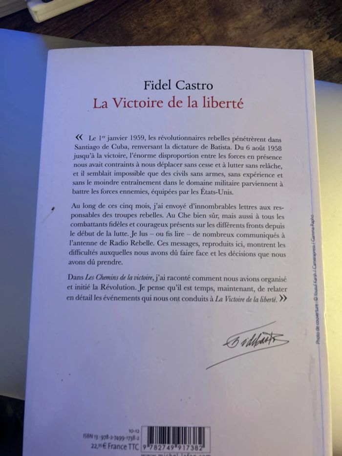« Le I* janvier 1959, les révolutionnaires rebelles pénétrèrent dans Santiago de Cuba, renversant la dictature de Batista. Du 6 août 1958 jusqu'à la victoire, l'énorme disproportion entre les forces en présence nous avait contraints à nous déplacer sans cesse et à lutter sans relâche, et il semblait impossible que des civils sans armes, sans expérience et sans le moindre entraînement dans le domaine militaire parviennent à battre les forces ennemies, équipées par les États-Unis. Au long de ces cinq mois, j'ai envoyé d'innombrables lettres aux responsables des troupes rebelles. Au Che bien sûr, mais aussi à tous les combattants fidèles et courageux présents sur les différents fronts depuis le début de la lutte. Je lus - ou fis lire - de nombreux communiqués à l'antenne de Radio Rebelle. Ces messages, reproduits ici, montrent les difficultés auxquelles nous avons dû faire face et les décisions que nous avons dû prendre. Dans Les Chemins de la victoire, j'ai raconté comment nous avions organisé et initié la Révolution. Je pense qu'il est temps, maintenant, de relater en détail les événements qui nous ont conduits à La Victoire de la liberté. »
