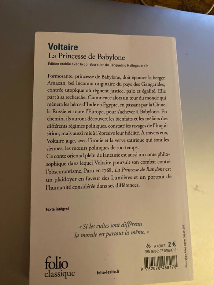 Formosante, princesse de Babylone, doit épouser le berger Amazan, bel inconnu originaire du pays des Gangarides, contrée utopique où règnent justice, paix et égalité. Elle part à sa recherche. Commence alors un tour du monde qui mènera les héros d'Inde en Égypte, en passant par la Chine, la Russie et toute l'Europe, pour s'achever à Babylone. En chemin, ils auront découvert les bienfaits et les méfaits des différents régimes politiques, constaté les ravages de l'Inqui-sition, mais aussi mis à l'épreuve leur fidélité. À travers eux, Voltaire juge, avec l'ironie et la verve satirique qui sont les siennes, les mœurs politiques de son temps. Ce conte oriental plein de fantaisie est aussi un conte philosophique dans lequel Voltaire poursuit son combat contre l'obscurantisme. Paru en 1768, La Princesse de Babylone est un plaidoyer en faveur des Lumières et un portrait de l'humanité considérée dans ses différences.