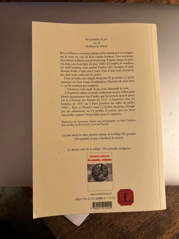 Éric et Thierry n'avaient jamais prêté attention à cet insigne sur la veste en cuir de leur copain Andreas. Une ancienne décoration militaire parmi beaucoup d'autres. Jusqu'au jour où, dans une boutique de jeux vidéo à Londres, le vendeur, un vieil homme, avait pointé l'index vers l'insigne. Il était devenu livide, s'était mis à crier. Puis il leur avait donné le jeu, leur avait ordonné d'y jouer. Dans la boîte, une simple disquette. Et pourtant, ce qu'ils voyaient sur leur écran d'ordinateur dépassait de loin tout ce qu'ils auraient pu imaginer. - Choisissez votre mode de jeu, avait demandé la voix. L'Expérience ultime n'est pas seulement un jeu vidéo, mais plutôt un passeport vers l'enfer, qui les renvoie dans le passé, sur le Chemin des Dames en 1917, à Guernica sous les bombes en 1937 ou à Paris pendant les rafles de juillet 1942... Éric et Thierry vont s'y brûler. Andreas, aveuglé par ses obsessions, va s'y perdre. À moins que ses deux camarades tentent l'impossible pour le ramener.