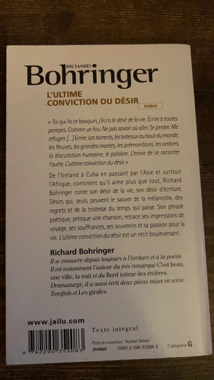 « Toi qui lis ce bouquin, j'écris le désir de la vie. Écrire à toutes pompes. Comme un fou. Ne pas savoir où aller. Se perdre. Me réfugier. [.) Écrire. Les torrents, les bateaux au bout du monde, les fleuves, les grandes marées, les prémonitions, les ombres, la discutation humaine, le palabre. L'envie de se raconter l'autre. L'ultime conviction du désir. » De l'Iceland à Cuba en passant par l'Asie et surtout l'Afrique, continent qu'il aime plus que tout, Richard Bohringer conte son désir de la vie, son désir d'écriture. Désirs qui, seuls, peuvent le sauver de la mélancolie, des regrets et de la tristesse du temps qui passe. Son phrasé poétique, presque une chanson, retrace ses impressions de voyage, ses souffrances, ses souvenirs et sa passion pour la vie.