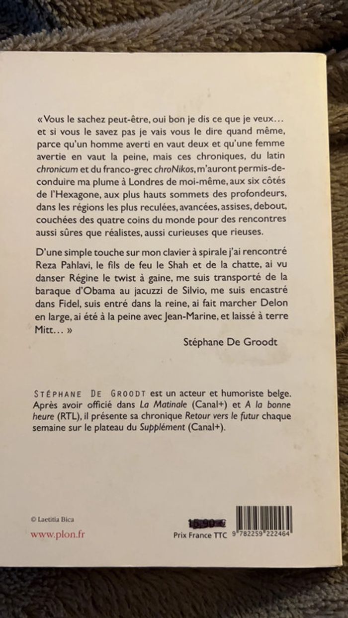 «Vous le sachez peut-être, oui bon je dis ce que je veux... et si vous le savez pas je vais vous le dire quand même, parce qu'un homme averti en vaut deux et qu'une femme avertie en vaut la peine, mais ces chroniques, du latin chronicum et du franco-grec chroNikos, m'auront permis-de-conduire ma plume à Londres de moi-même, aux six côtés de l'Hexagone, aux plus hauts sommets des profondeurs, dans les régions les plus reculées, avancées, assises, debout, couchées des quatre coins du monde pour des rencontres aussi sûres que réalistes, aussi curieuses que rieuses. R…