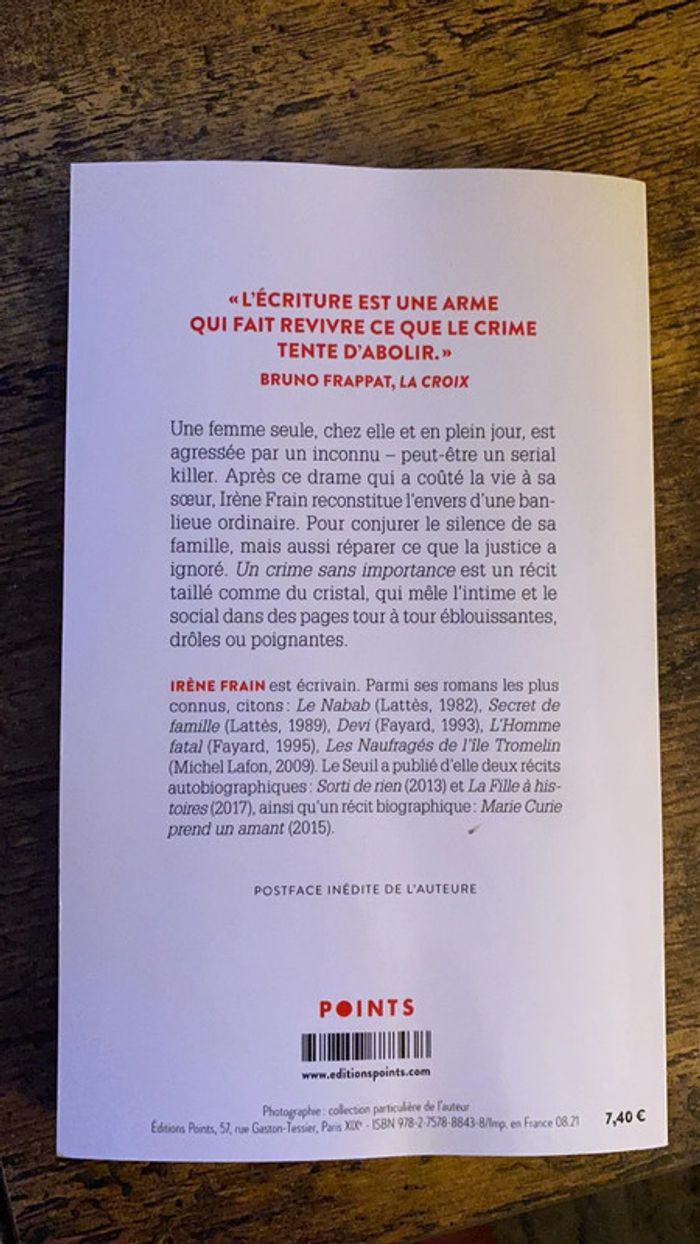 Une femme seule, chez elle et en plein jour, est agressée par un inconnu - peut-être un serial killer. Après ce drame qui a coûté la vie à sa sœur, Irène Frain reconstitue l'envers d'une banlieue ordinaire. Pour conjurer le silence de sa famille, mais aussi réparer ce que la justice a ignoré. Un crime sans importance est un récit taillé comme du cristal, qui mêle l'intime et le social dans des pages tour à tour éblouissantes, drôles ou poignantes.