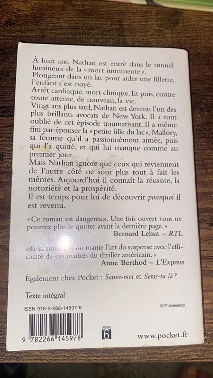 À huit ans, Nathan est entré dans le tunnel lumineux de la « mort imminente ». Plongeant dans un lac pour aider une fillette, l'enfant s'est noyé. Arrêt cardiaque, mort clinique. Et puis, contre toute attente, de nouveau, la vie. Vingt ans plus tard, Nathan est devenu l'un des plus brillants avocats de New York. Il a tout oublié de cet épisode traumatisant. Il a même fini par épouser la « petite fille du lac », Mallory, sa femme qu'il a passionnément aimée, puis qui l'a quitté, et qui lui manque comme au premier jour.. Mais Nathan ignore que ceux qui reviennent de l'autre côté ne sont plus tout à fait les mêmes. Aujourd'hui il connaît la réussite, la notoriété et la prospérité. Il est temps pour lui de découvrir pourquoi il est revenu.