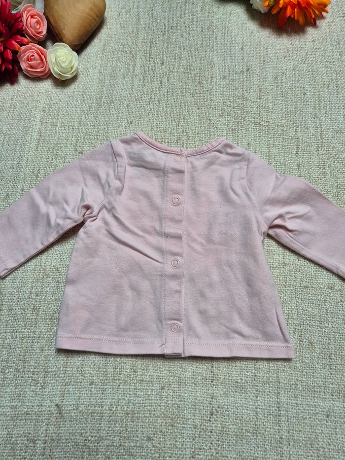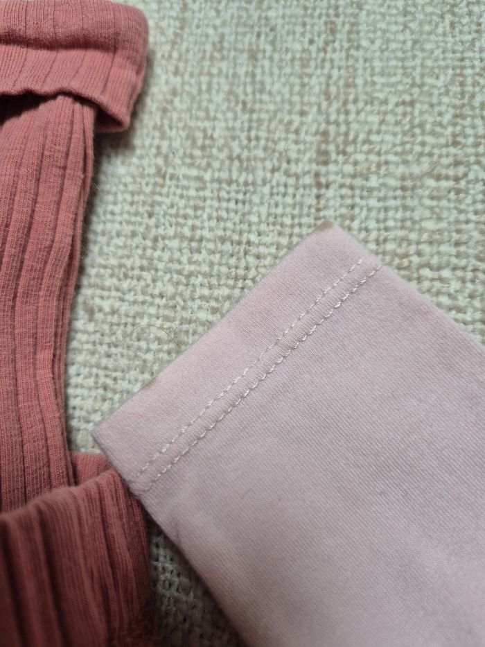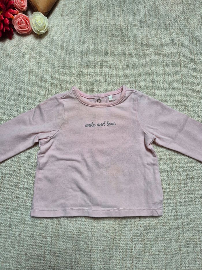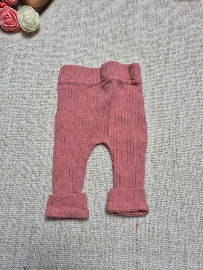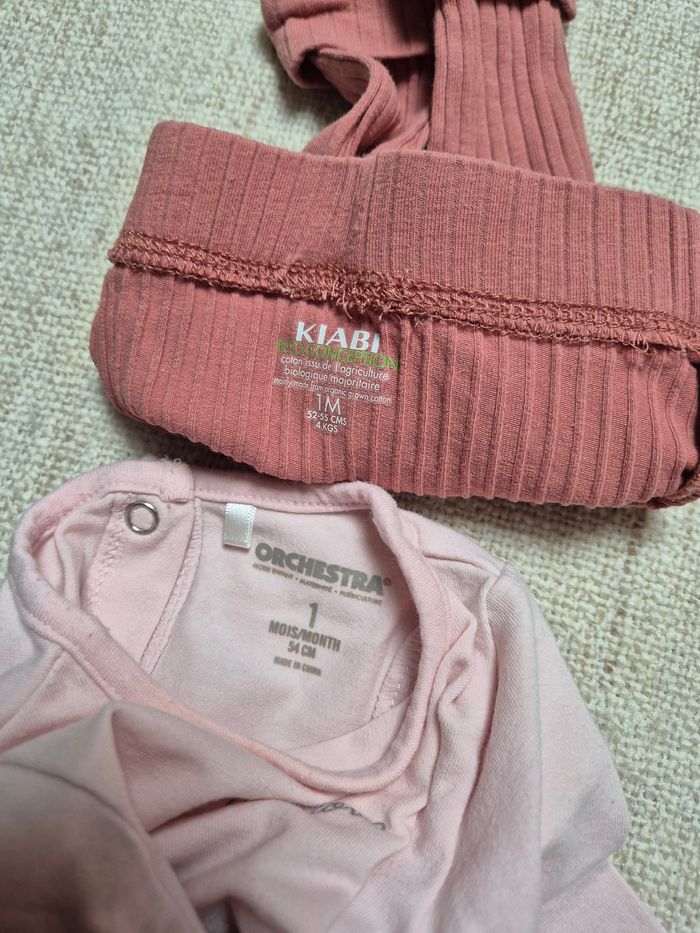 Ensemble en taille 1 mois. T-shirt manches longues Orchestra. Il est rose avec l'inscription Smile and love. Boutons pressions sur toute la longueur dans le dos. Legging côtelé Kiabi vieux rose. Revers aux chevilles et boutons aspect bois. L'ensemble est en très bon état excepté le bord de la manche qui est légèrement taché (voir dernière photo).