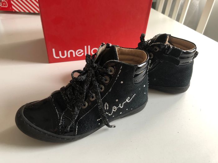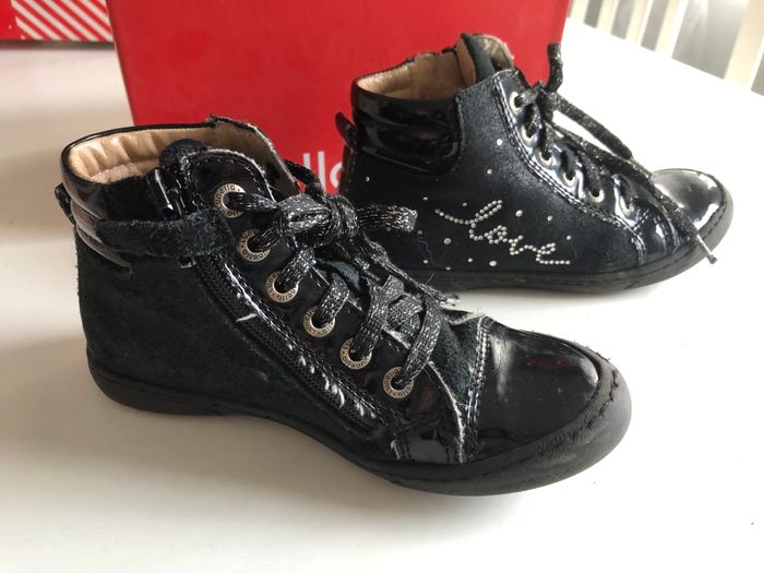 Jolie paire de chaussures fille, avec pour motif le mot "love" en strass et strass autour Avec lacet et tirette latérale Marque Lunella Taille 29 Bien portées
