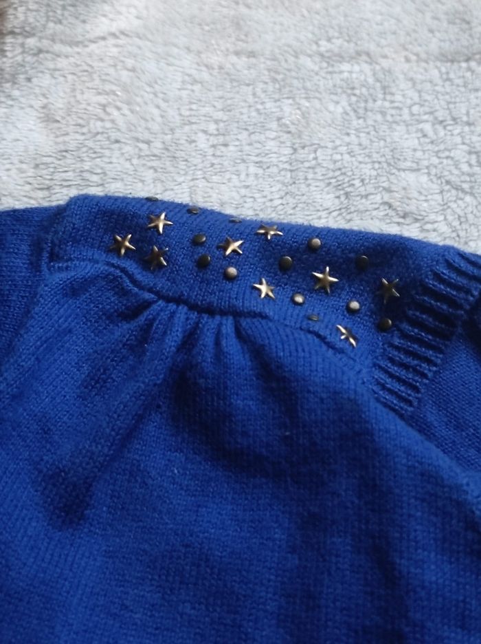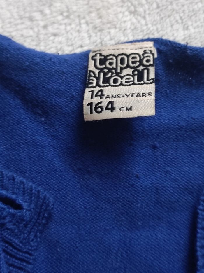 superbe gilet bleu électrique avec étoiles doré/bronze sur les épaules, fermeture à petit boutons. De la marque tape à l'oeil taille 14ans. Peu porté en parfait état.