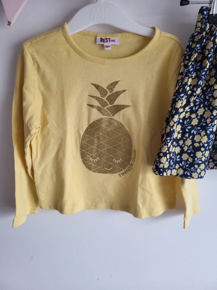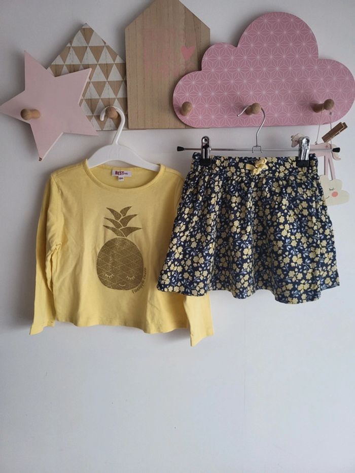Ensemble JBC, comprennant le t shirt longues manches, taille 4ans/104cm (en bon etat, petites taches sur la manche, voir photo) et une jupe fleurie en tres bon etat taille 3ans/98cm mais avec elastique a la taille #nicolasgtaille4ans
