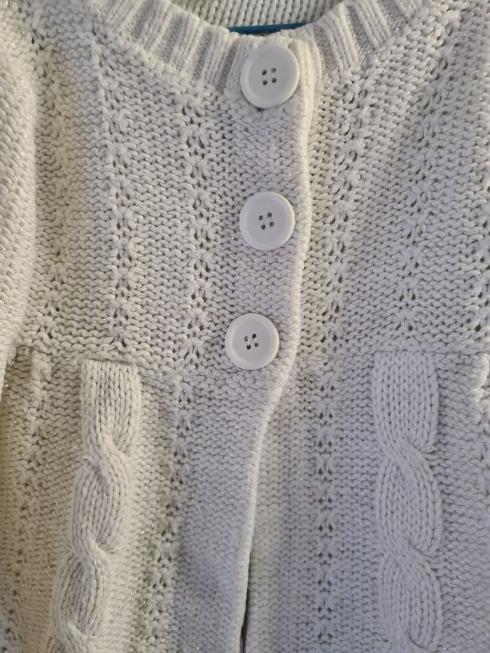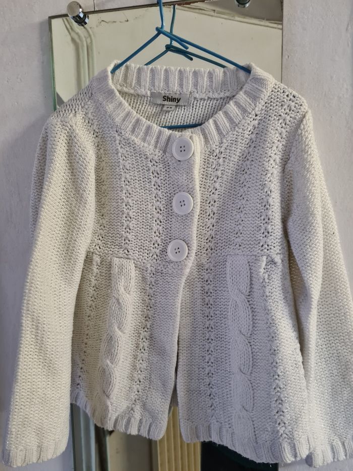 Gilet en maille, avec fil argenté sur tout le gilet. Très bon état. Se ferme avec les trois boutons. Très peu porté