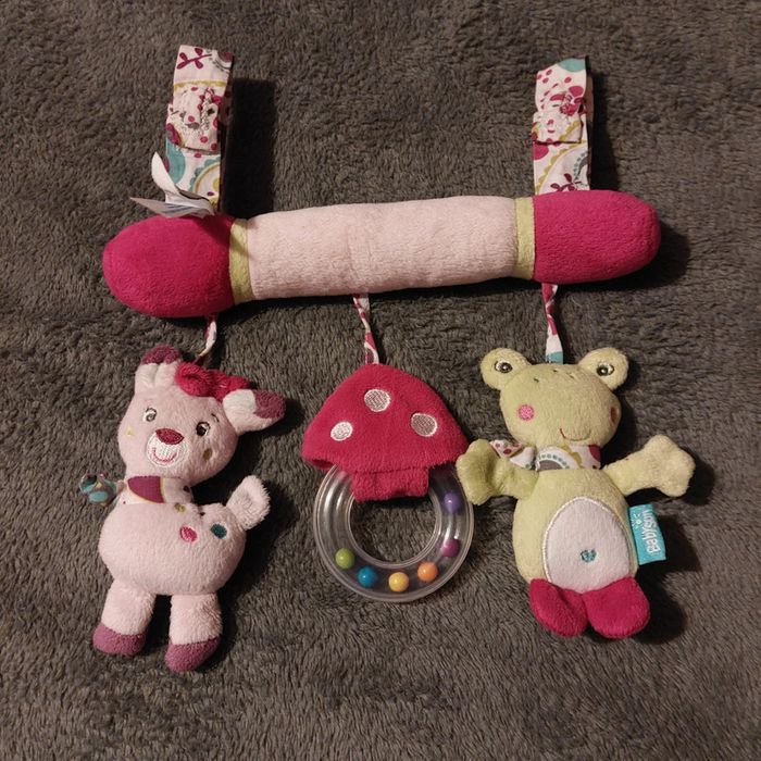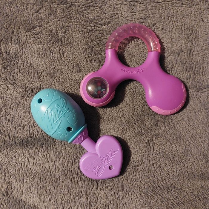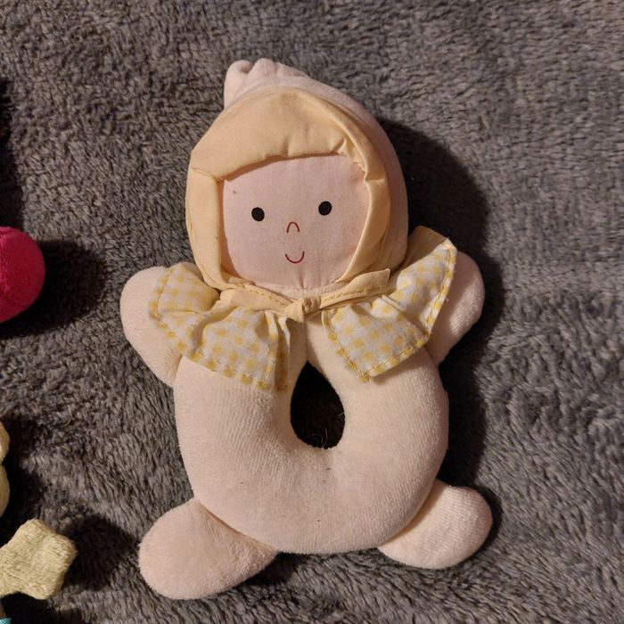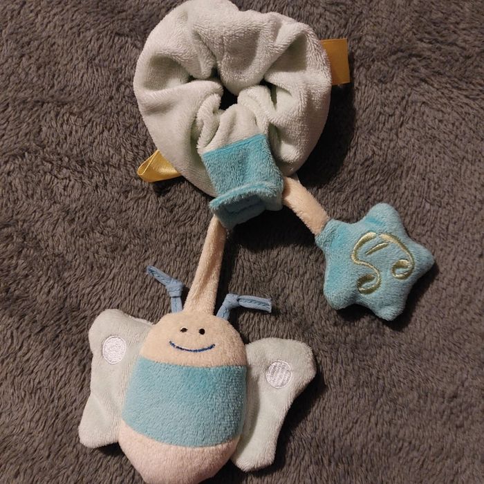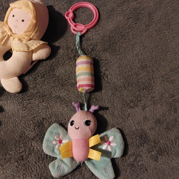 #jessicadebreujouetbebe 2 jouets à accrocher (celui papillon bruit de grelot) Un papillon en tissu que l'on peux accrocher au poignet ne fait plus de musique Un hochet poupée en tissu Un petit hochet en plastique et un anneau de dentition