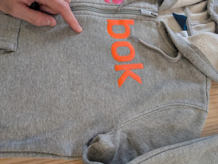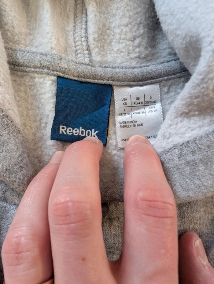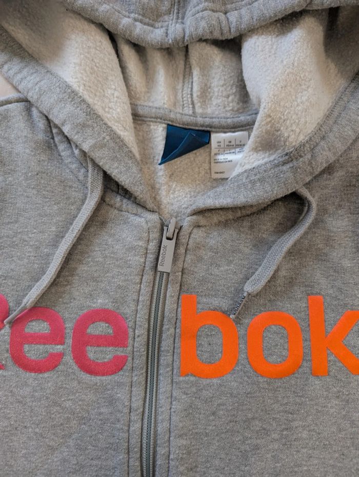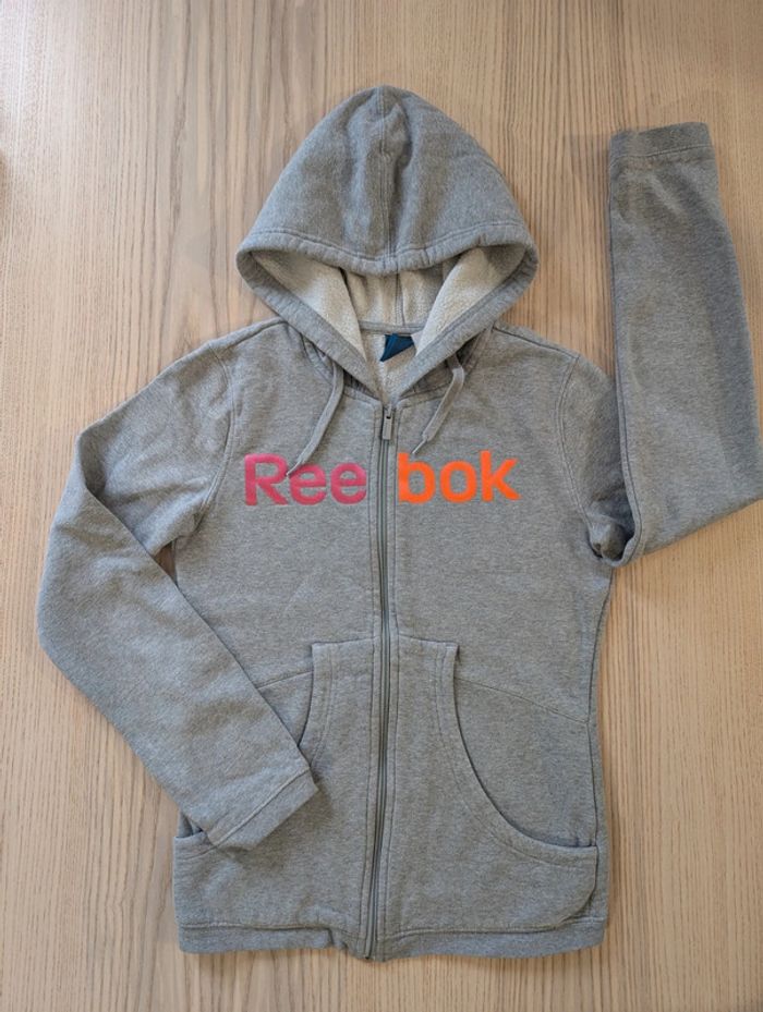 Sweat zippé femme avec capuche. Marque Reebok Taille XS. Déjà porté traces d'usure type bouloches visible en photos, reste en bon état, pas de tâches ni de trous. #tennytebvetementsfemme #tennytebvetementsfemmesport #reebok