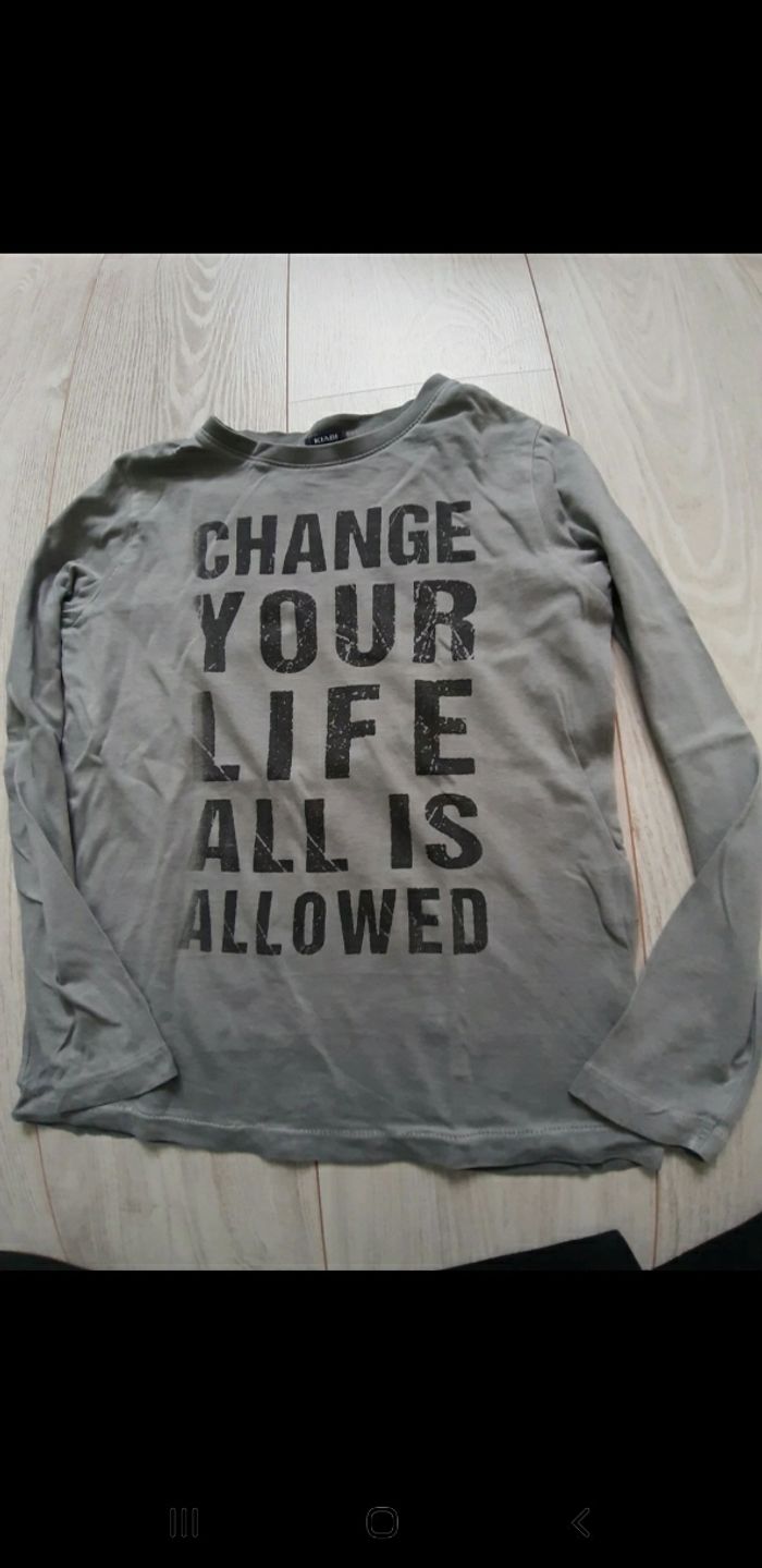 Tee-shirt manches longues taille 8 ans marque kiabi gris avec écritures sur le devant