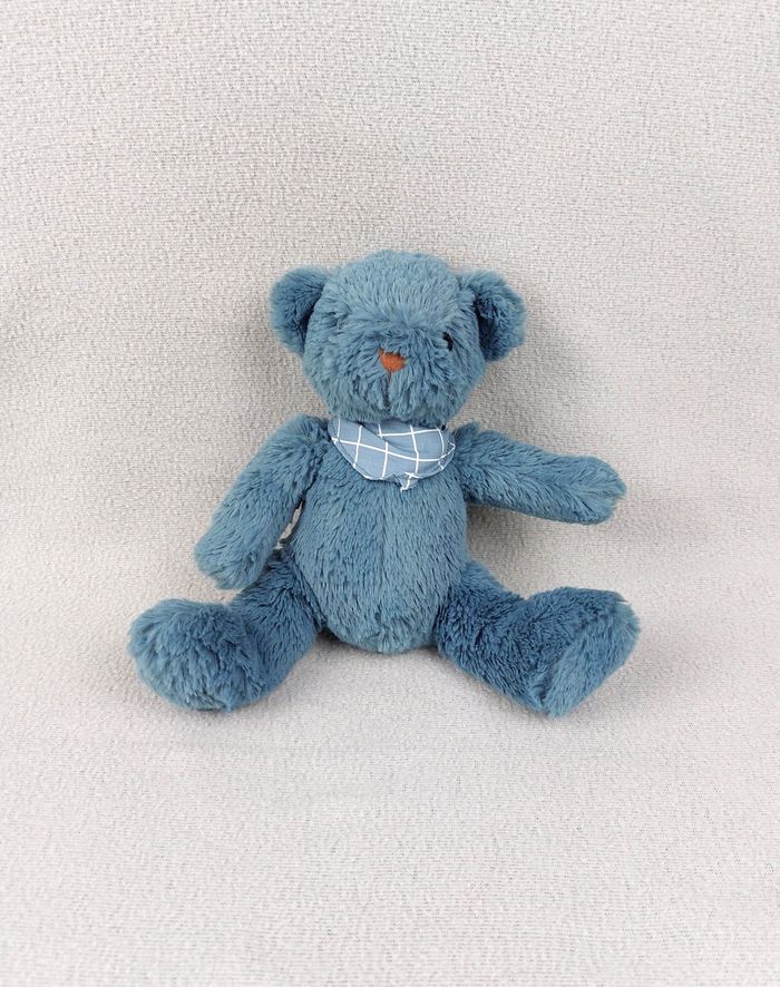 Peluche doudou ours bleu pétrole PRIMATIS B bandana à carreaux 20 cm assis TBE - photo numéro 1