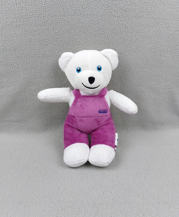 Peluche doudou ours blanc GALLIA salopette mauve violet yeux bleus 25 cm TTBE - photo numéro 1