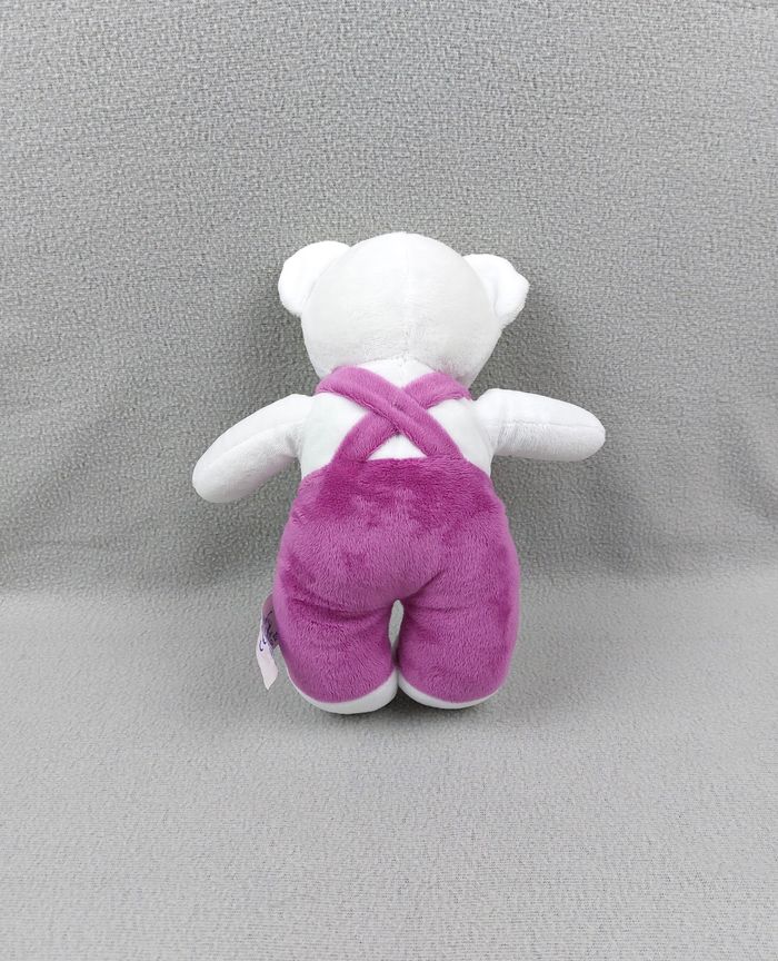 Peluche doudou ours blanc GALLIA salopette mauve violet yeux bleus 25 cm TTBE - photo numéro 2