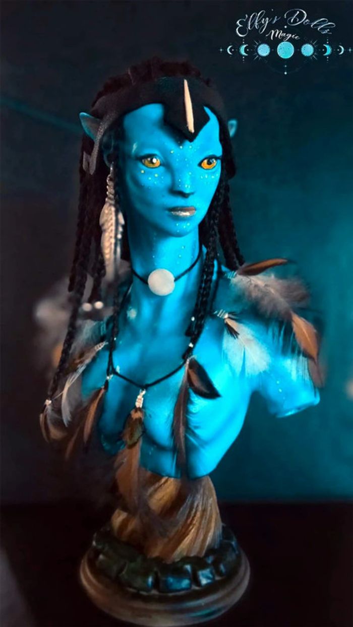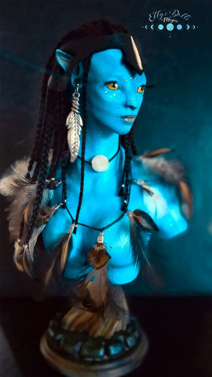 Statuette en résine , artisanale. Inspirée du film avatar. Cheveux en alpaga, peinte à la main. Brille sous lumière UV. Accessoires, nacre et plumes. Attention ceci n'est pas un jouet.