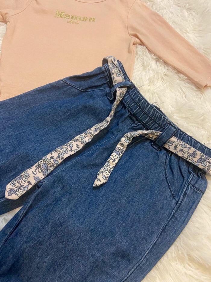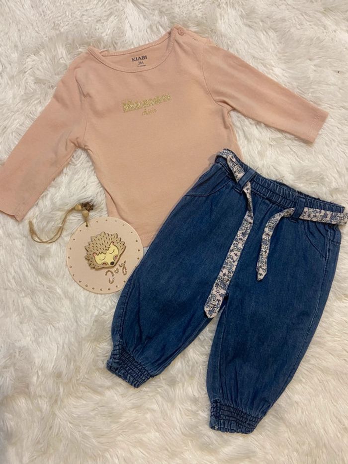 Description 🌸 : Adorable ensemble pour bébé, taille 3 mois. • Marque : Kiabi • État : Très bon état, aucun défaut (ni tâche ni trou). • Couleur : rose et bleu. • Détails supplémentaires : ensmzble haut manche longue et pantalon serrer au cheville, ceinture fleuri. N’hésitez pas à me contacter pour plus d’informations ou des photos supplémentaires ! ☀️