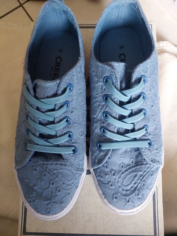 Baskets tissu bleues marque creeks. Tissu broderie anglaise bleue. Lacets en élastiques. En très bon état.