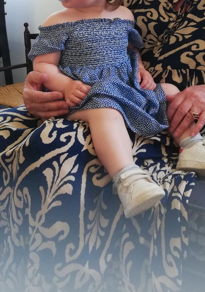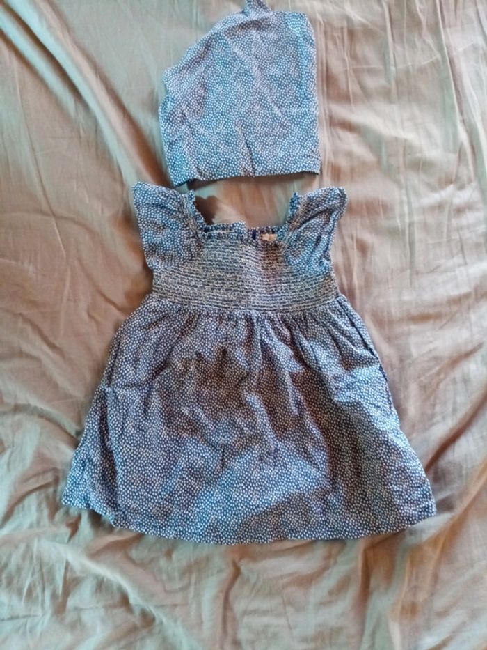 Magnifique robe bout'chou et son fichu assorti Légère idéale grosses chaleur Le haut est smocké, trop mignonne portée ! En très bon état Taille grand 18 mois