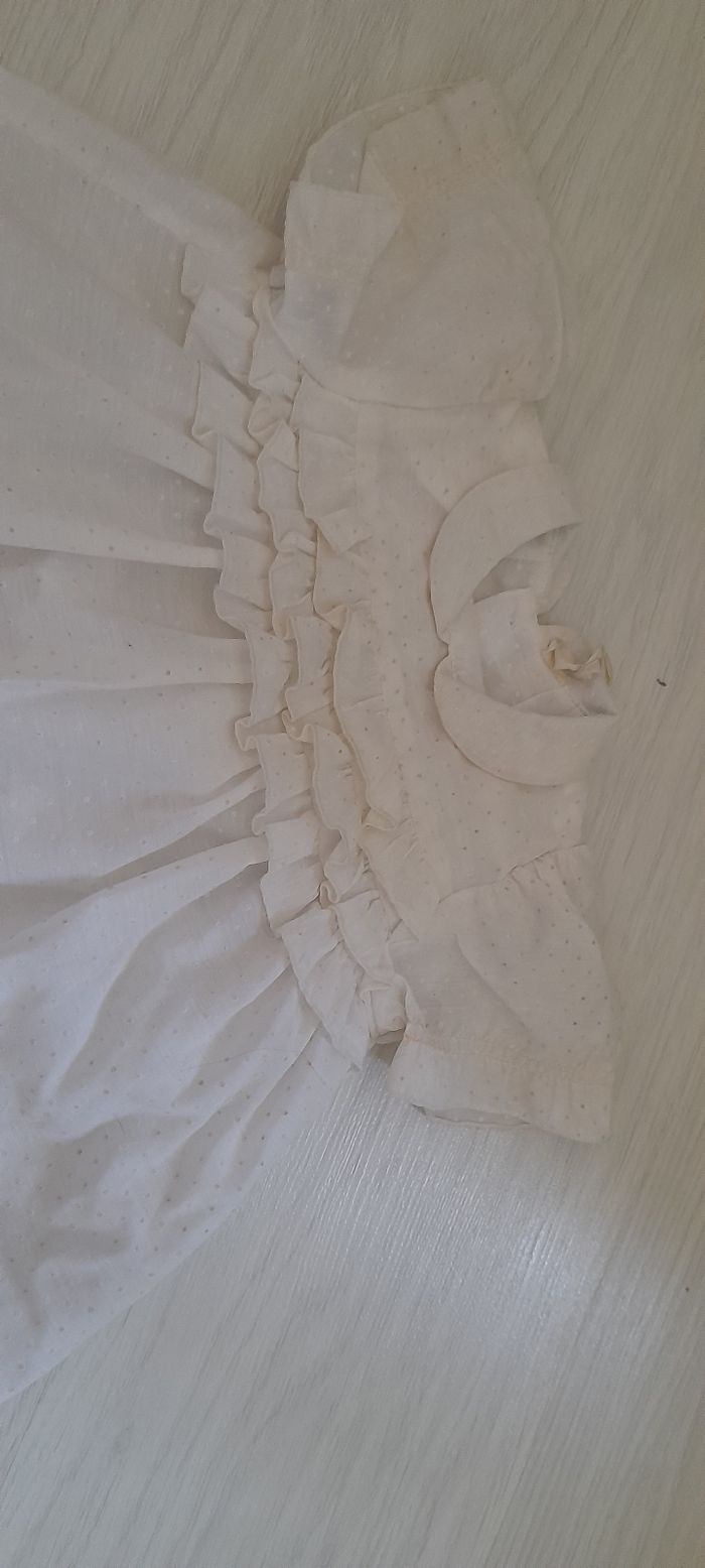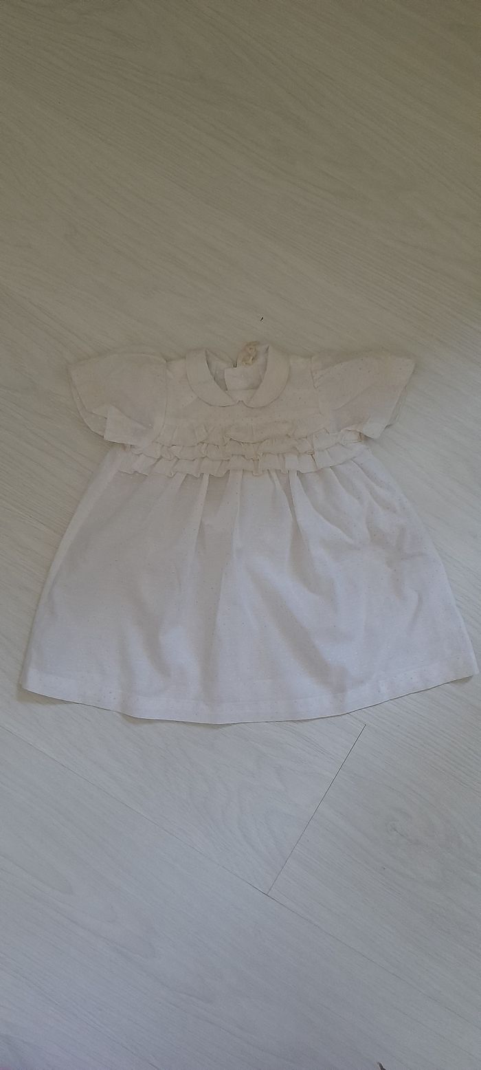 Robe 6 mois Marque PETIT DIABLE Couleur blanc cassé Manches courtes Attache boutons sur mi dos Très bon état