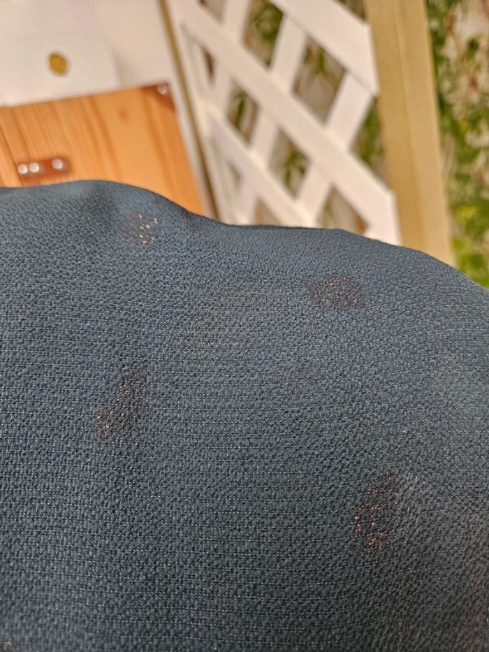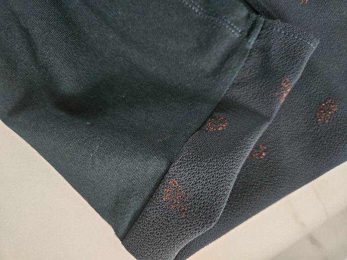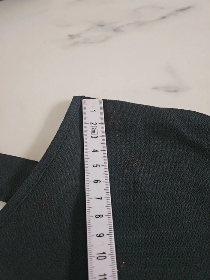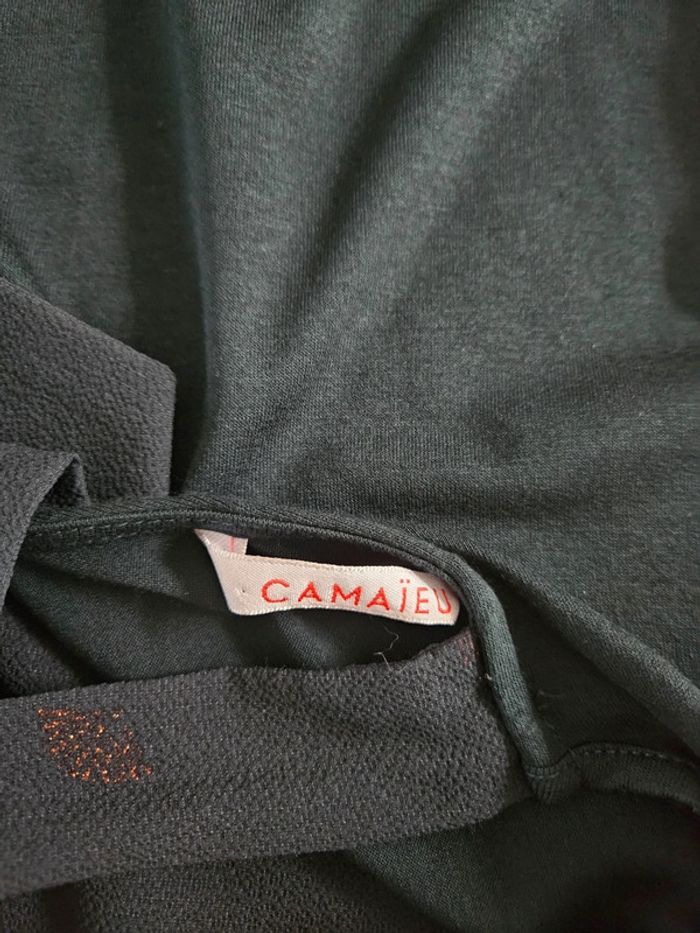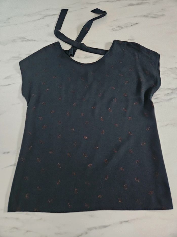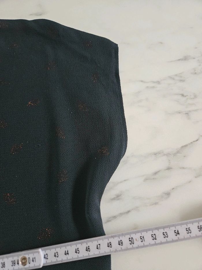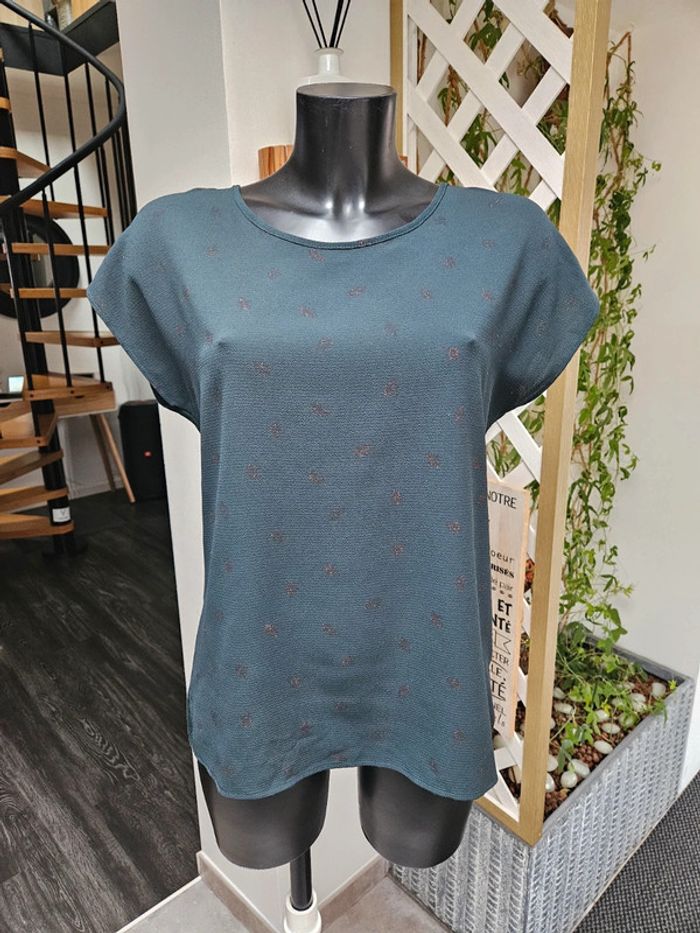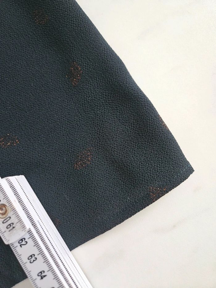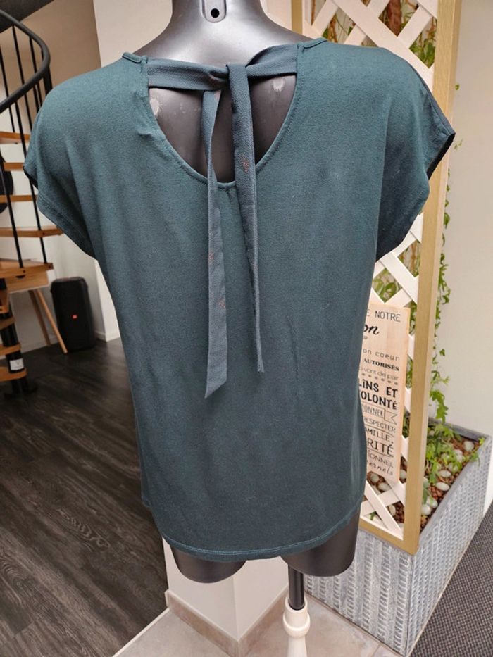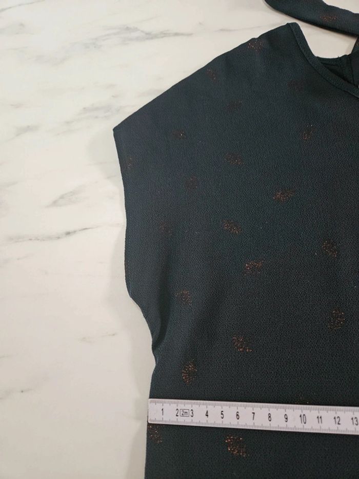 Blouse verte motifs dorés à nouer dans le dos. Matière un peu crépon sur le devant et coton pour l'arrière. Portée mais reste en très bon état. Dimensions sur les photos