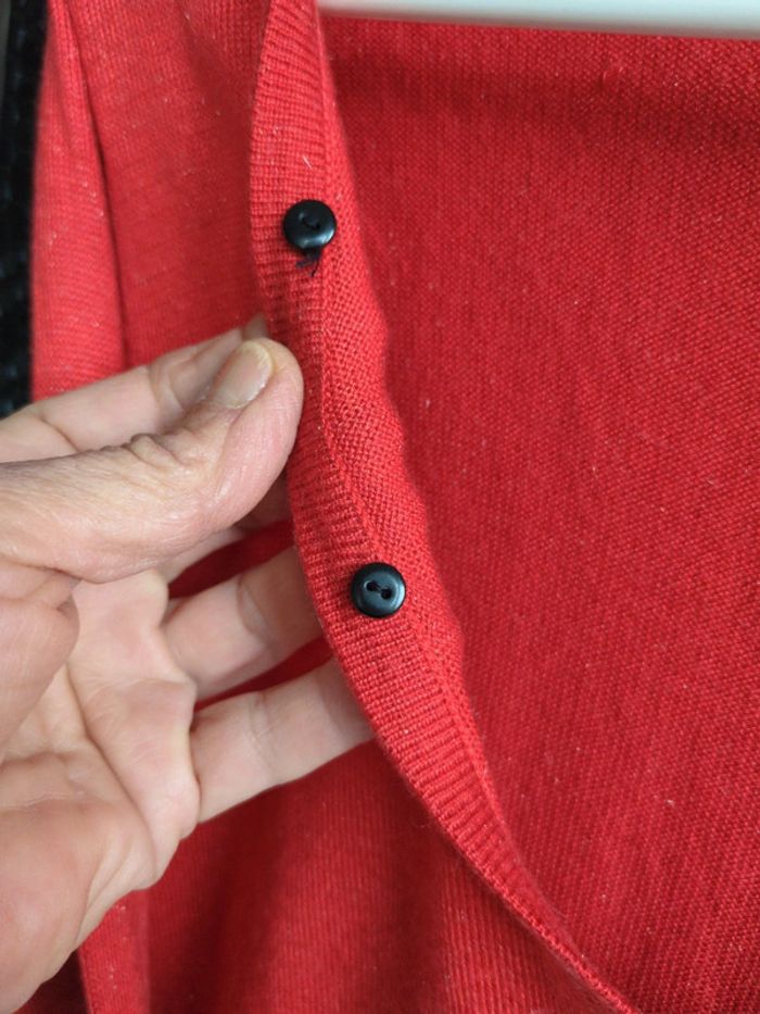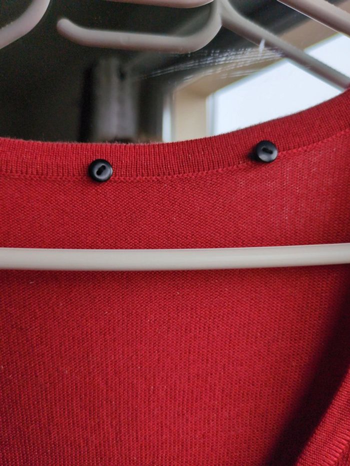 Mesures 40/42/61. Très beau pull léger coton mélangé lurex corail, col V avec boutons. Parfait état.