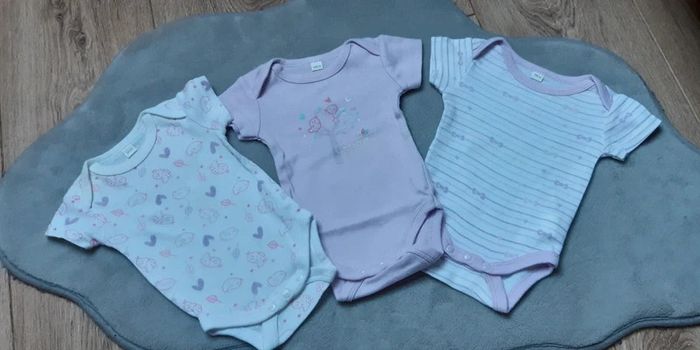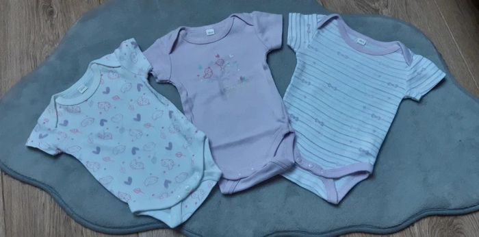 PRIX DE VENTE FERME MERCI Lot de 3 bodies Manches courtes blanc/parme 1 mois en très bon état (couleurs vives, sans trou, sans tâches, non décolorés) Pour visualiser tous ce que je possède en 1 mois : #ambre626901mois