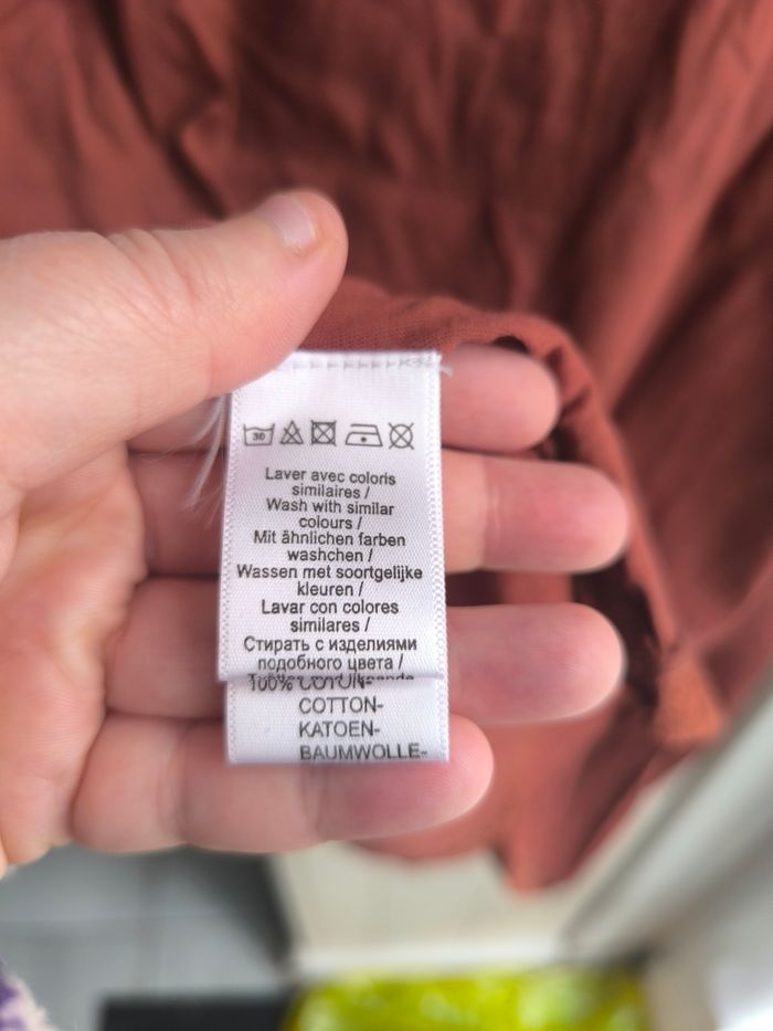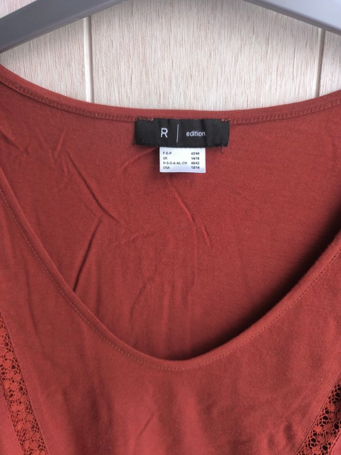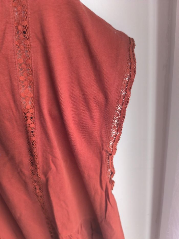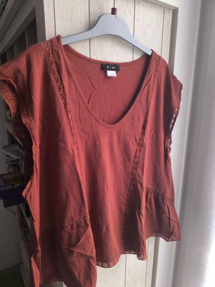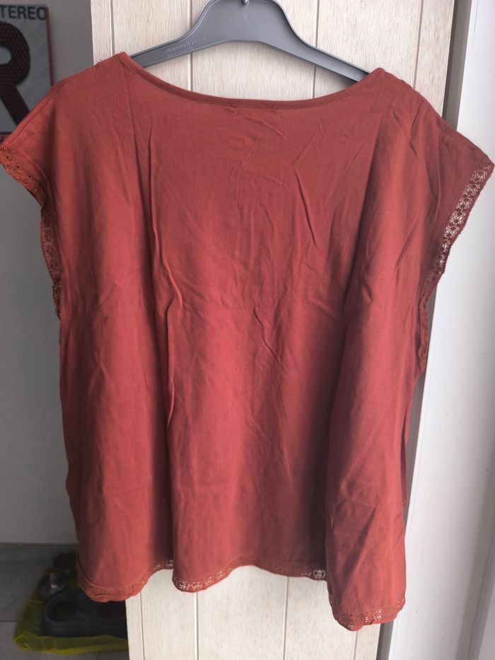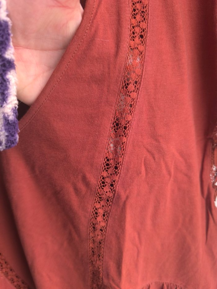 Jolie blouse légère col V avec détails en dentelle , l'encolure des manches assez larges,de couleur marron foncé Marque:La redoute Taille:42/44 mensurations en photo pas de photos portées je ne rentre pas dedans Matière:100% coton Etat: Très bon état peu porté