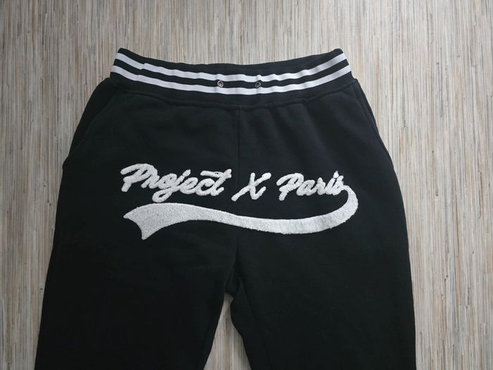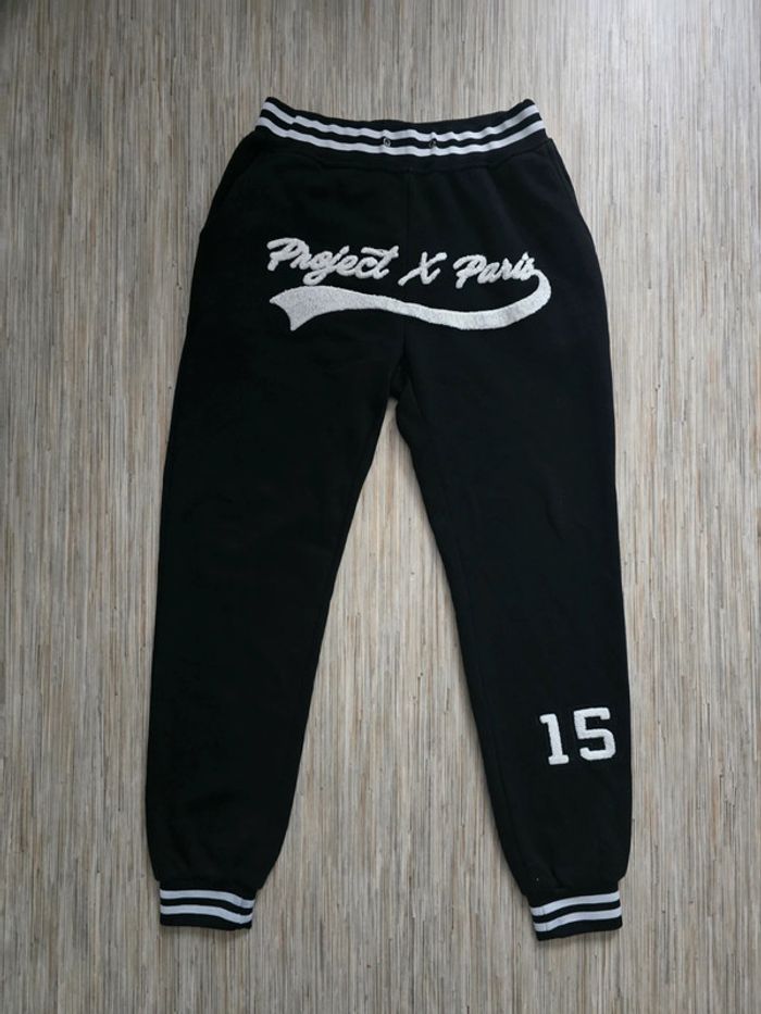 Bas de jogging noir et blanc Projet X Taille L En très bon etat général, mais je signale que les bouclettes sur la barre du T se sont légèrement defaite. Il n'y a plus le cordon.