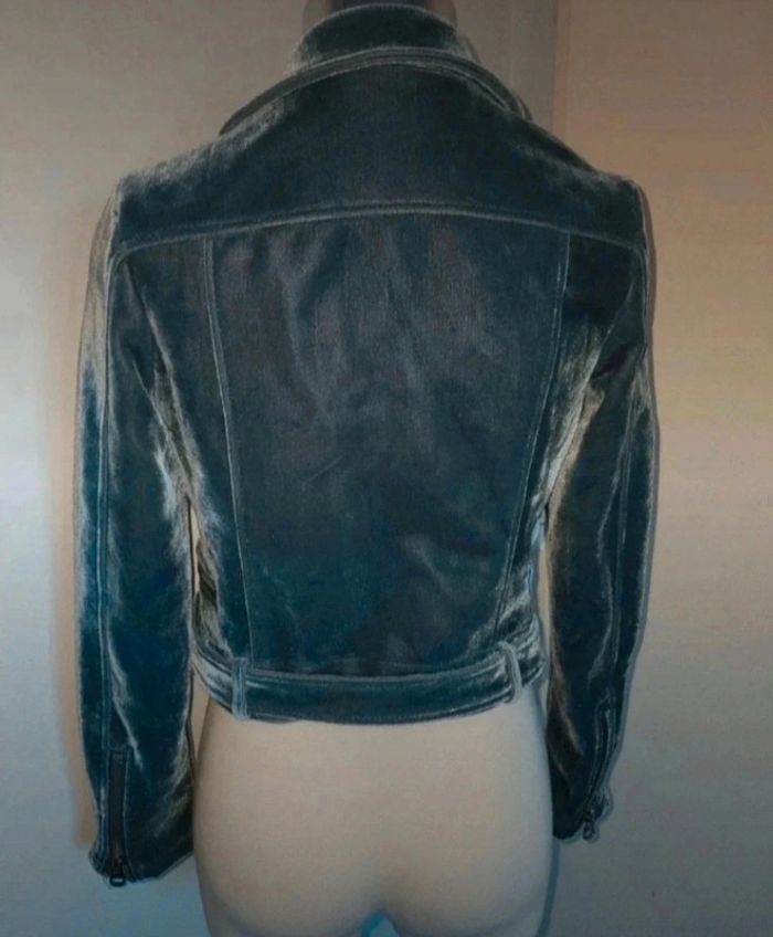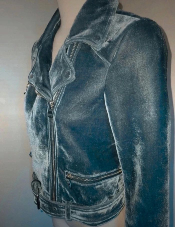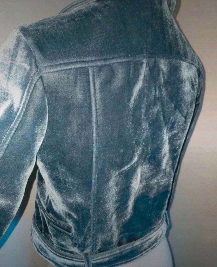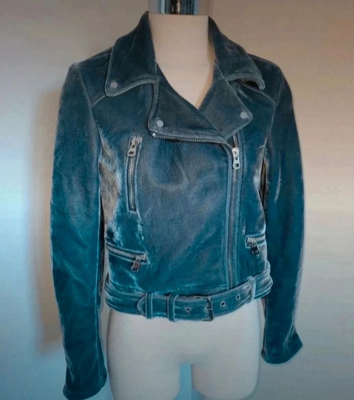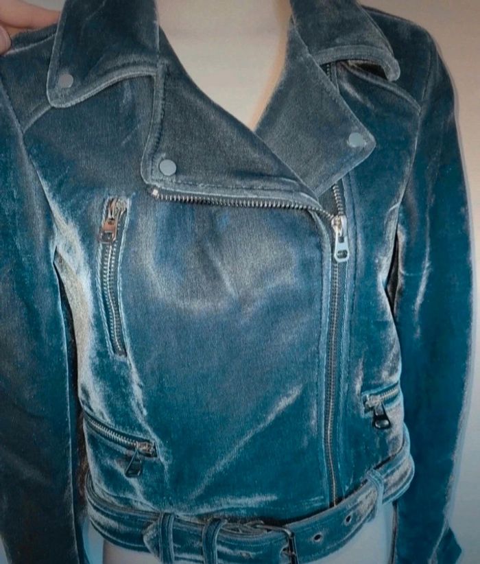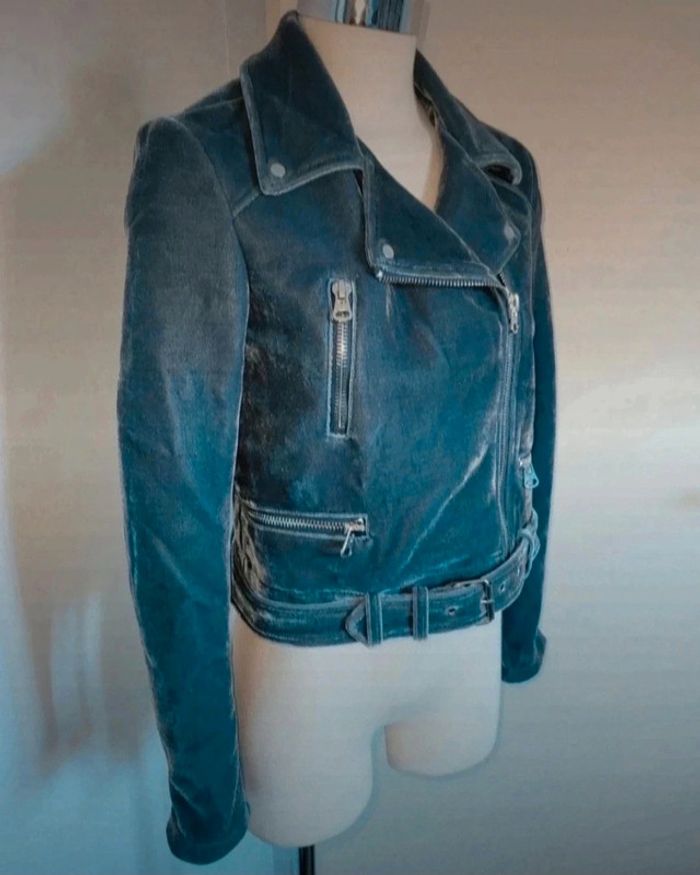 Veste style biker. - Matière épaisse effet velours. - Coloris bleu. - pattes rivetées au col avec pressions. - 2 poches sur les côtés et 1 poche sur la poitrine zippées. - Ceinture à la taille avec boucle argentée. Correspond à une taille S #A2life_taille36