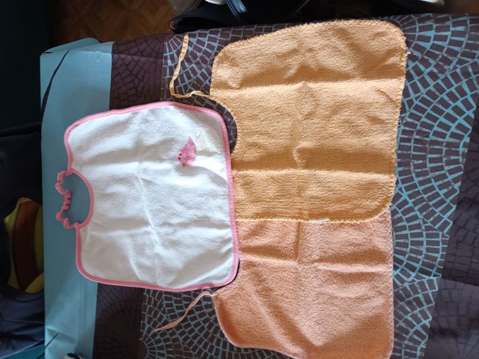 lot de 3 bavoirs fille 1 se passe par la tete et les 2 autres se nouent avec cordon bon etat