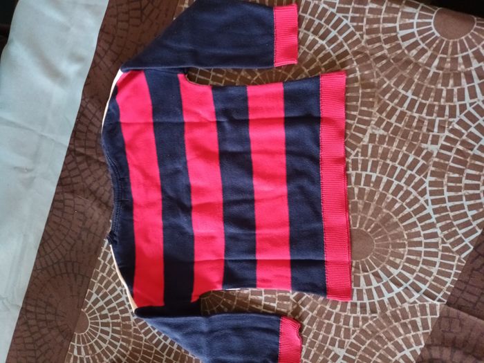 pull fille 3 ans couleur bleu marine, blanc et fuschia arriere different de l avant marque du pareil au meme motif rayures tres bon etat
