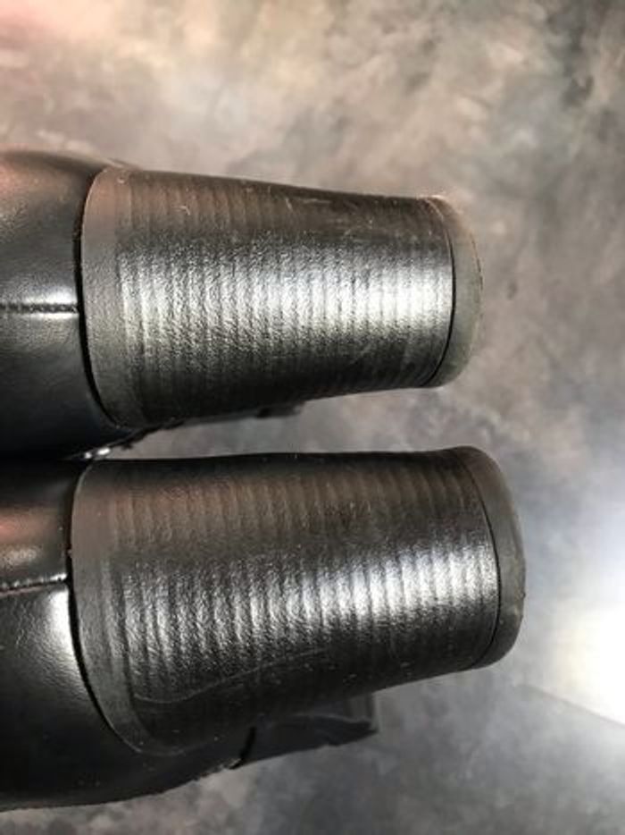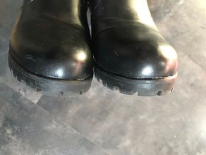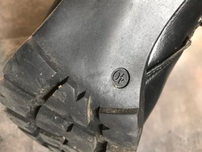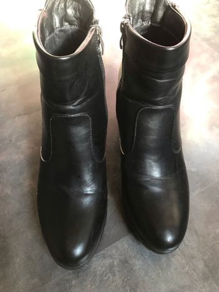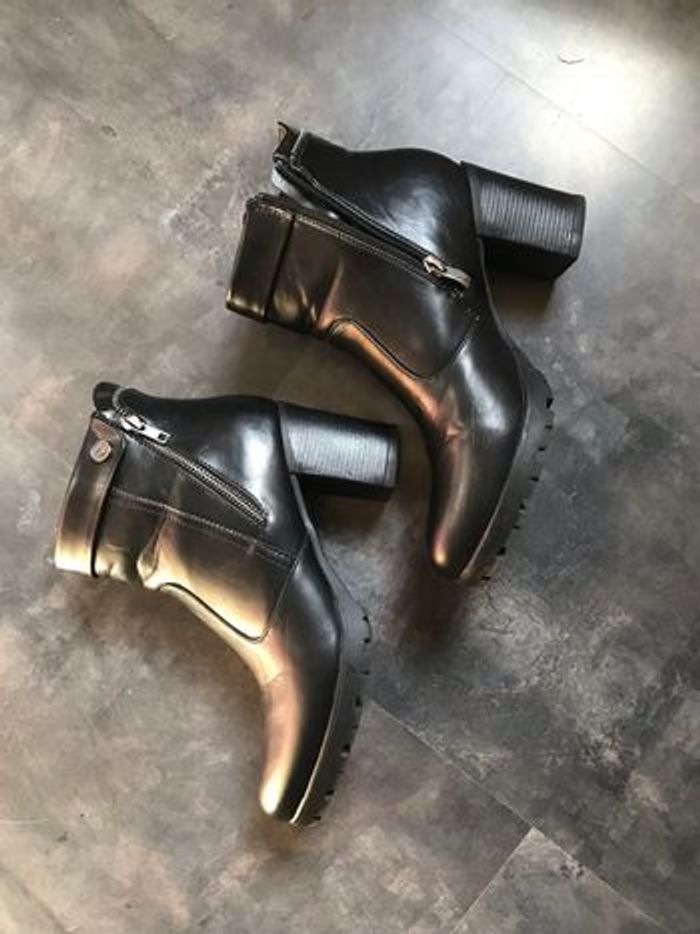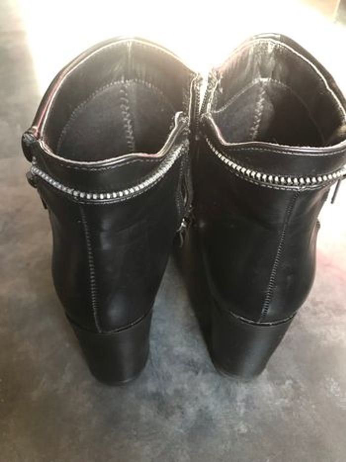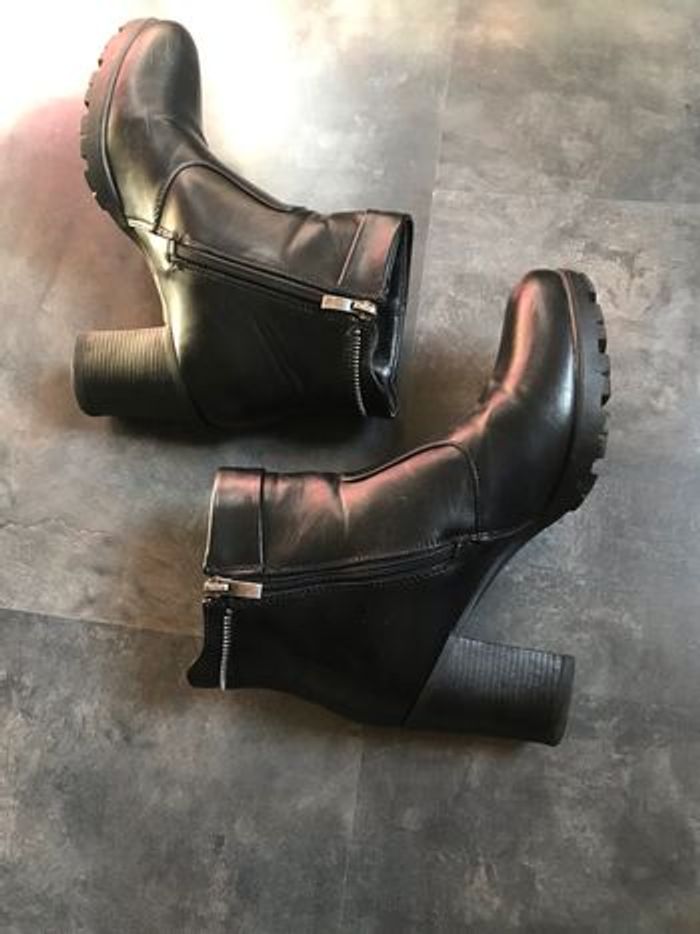 Jolies Bottines noires Hauteur talons 8,5 cm mais Hauteur semelles de 2 cm, ce qui ramène une marche à 6,5 cm de talons Pointure 40 Bon état général, peu portées