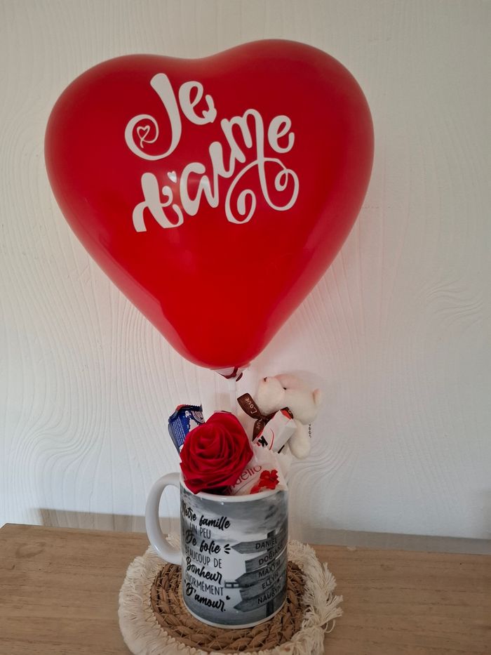L'atelier de Dodo Vous propose une coffret spécial St Valentin Ou autres occasion Comprenant un mug personnalisé ( photo texte prénom date ....) Un porte clés ourson personnalisé au prénom de votre choix Une rose en satin Des petits chocolats Et un ballon cœur également personnalisé
