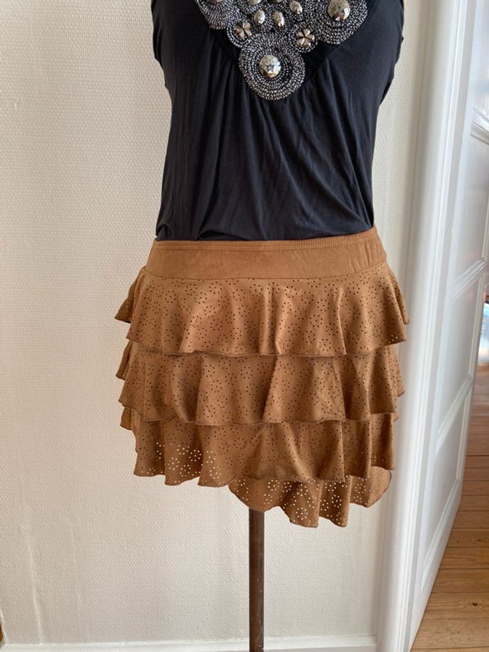 jupe en imitation daim couleur camel portée une fois élastiquée à la taille petit L, bon M