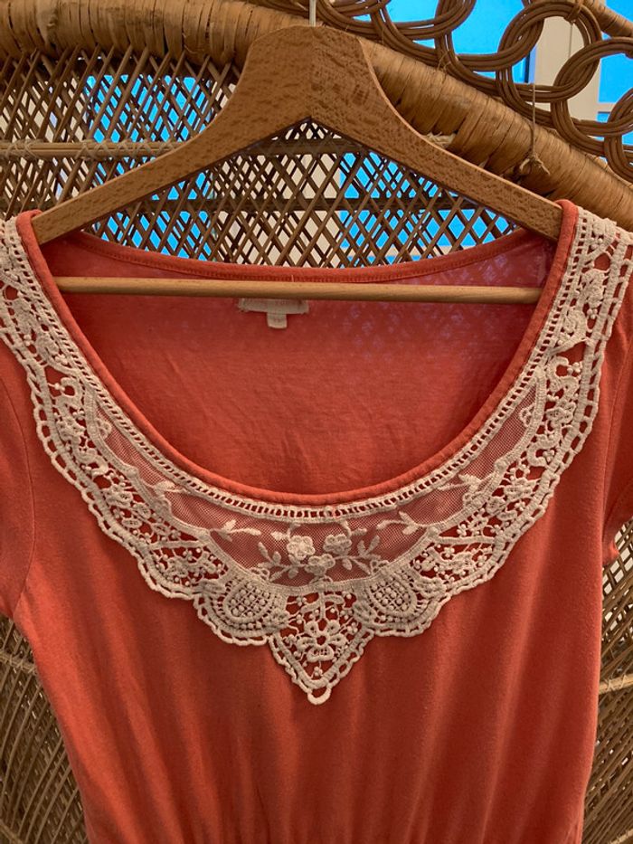 petite robe légère en coton très agréable attache ceinture à la taille cou brodé bon état couleur corail