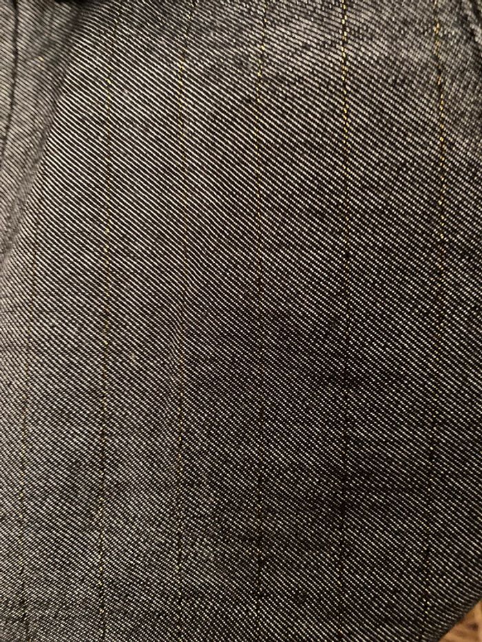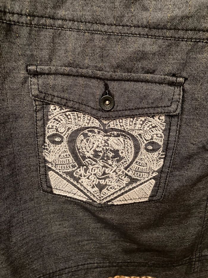 jupe courte en jeans très fin irisé de fil d’or poches brodée et ceinture noir en tissu très peu portée en très bon état