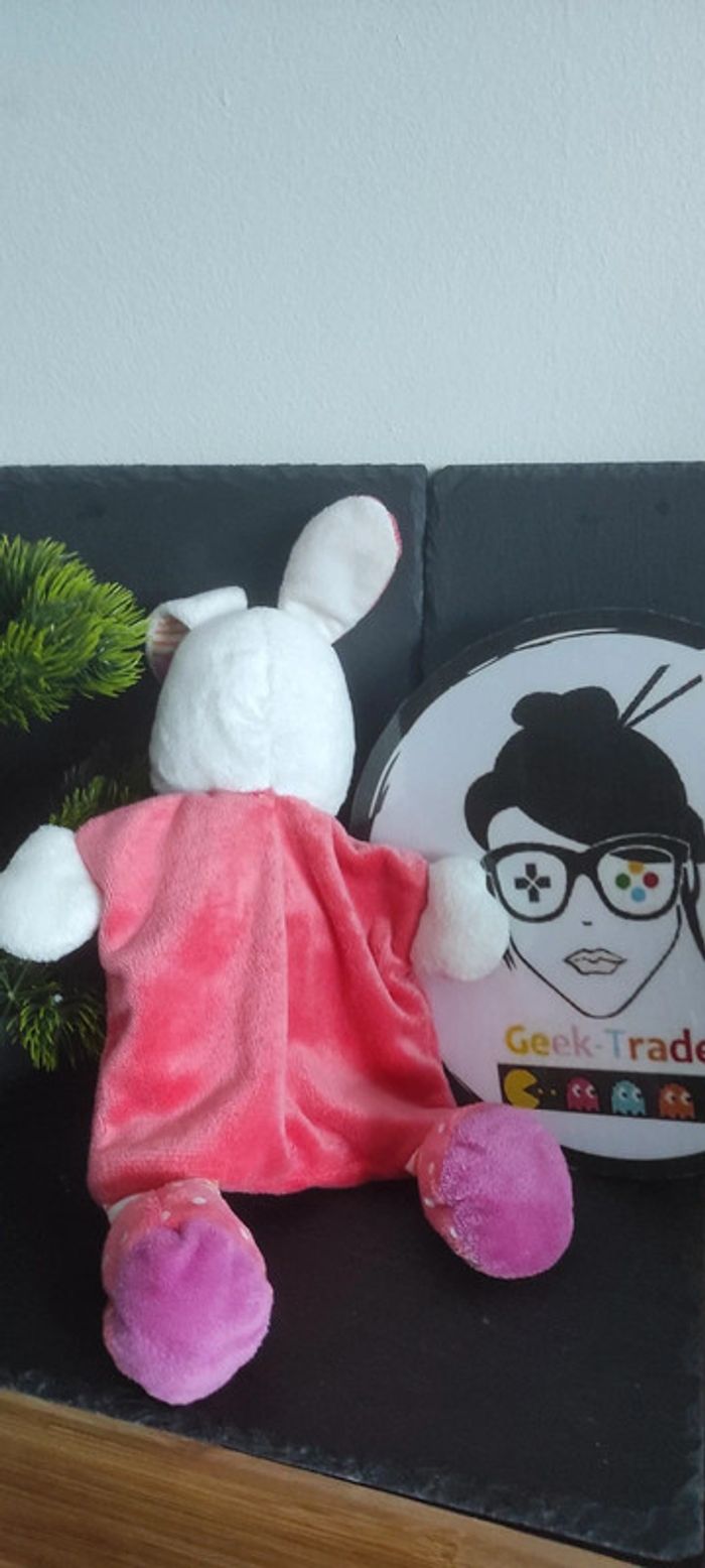 Doudou plat lapin blanc rose pois coeur nicotoy grelot ballon orange
