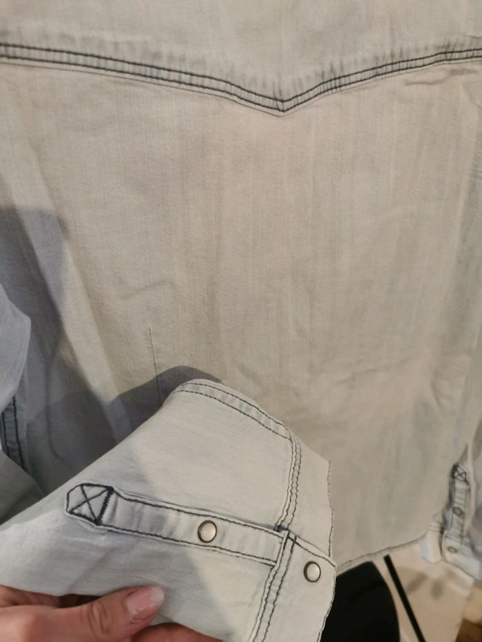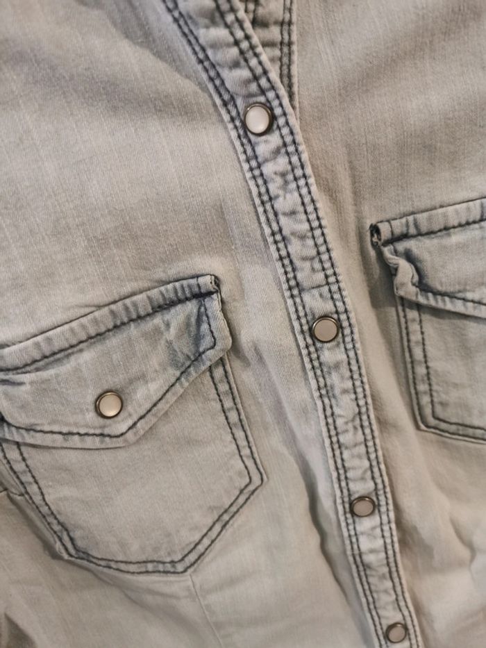Chemise cintrée en jean à pression Taille 40 mais taille petit c est plus une taille 38 Elasthane dans la compo Excellent état