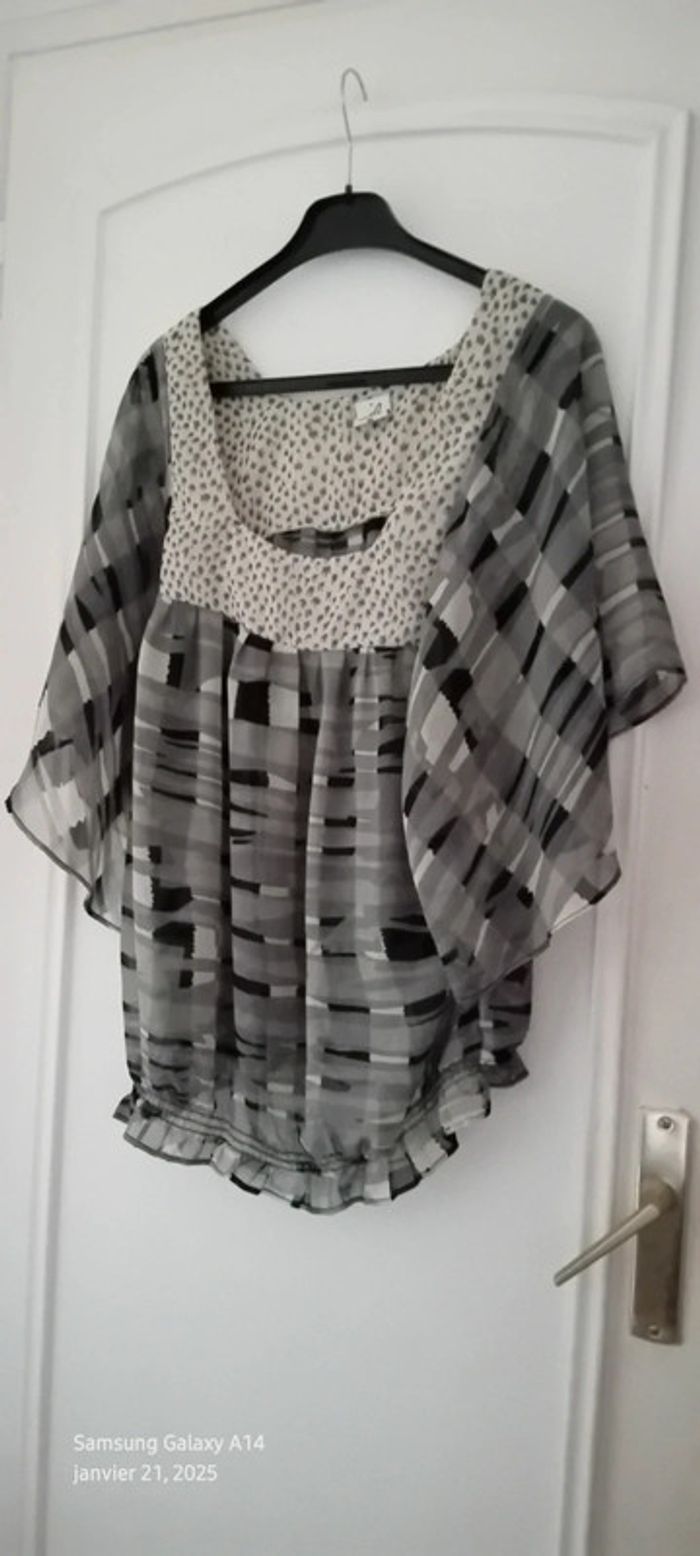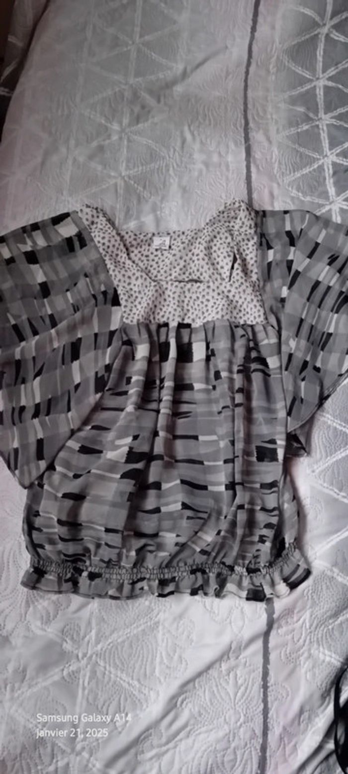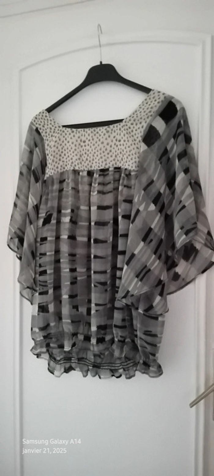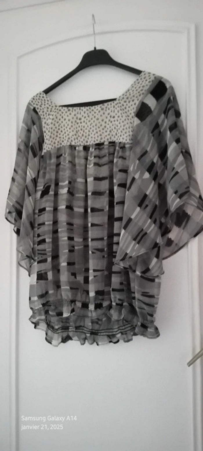 Blouse en polyester aspect voile manches courtes et larges chauve souris volantées motif abstrait traits noir blanc gris bas resseré élastique longueur 72 vm largeur aisselles à aisselles 62 cm largeur épaules 58 cm taille 46 très peu portée en très bon état #midole #midolefemme #midolefemme46 #blousefemme46 #blousemancheschauvesouris #blousemancheslarges #blousemotifabstrait #femme46 #blousejacquelineriu #jacquelineriu #gris