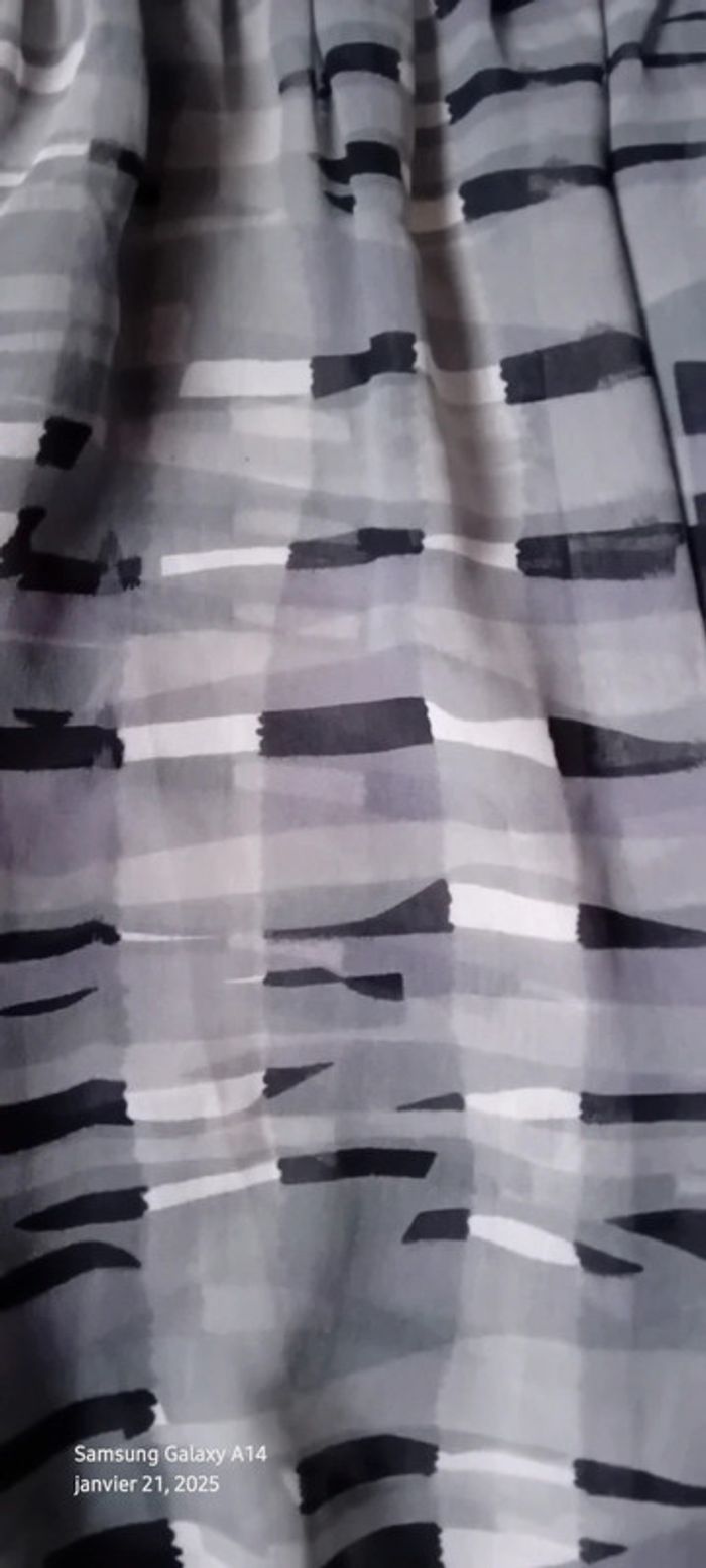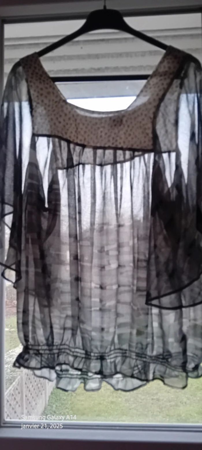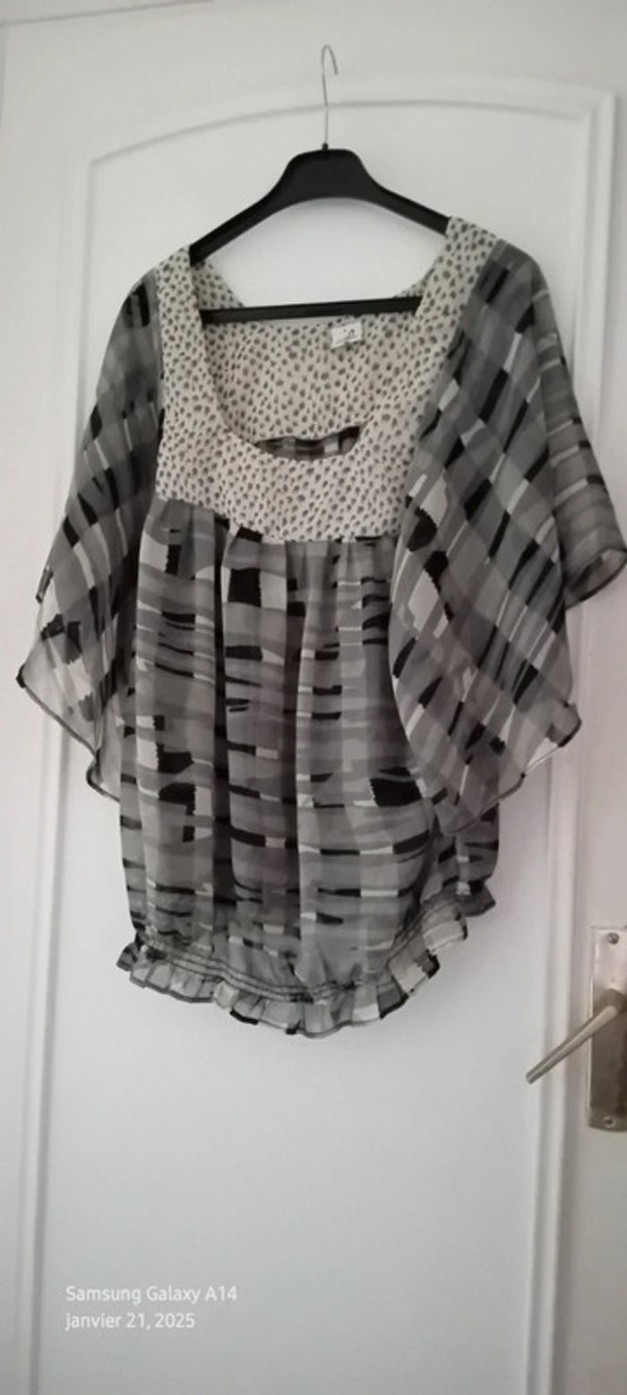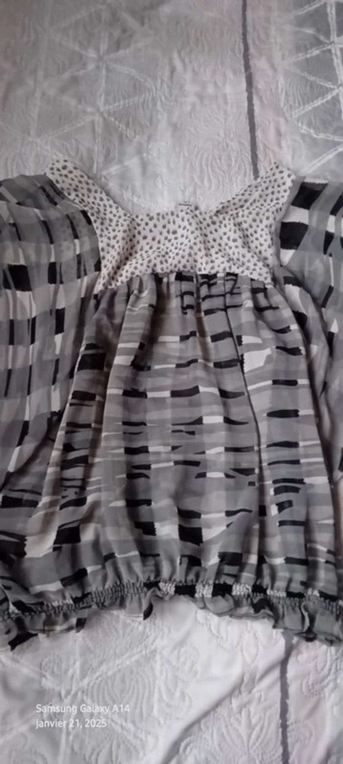 Blouse en polyester aspect voile manches courtes et larges chauve souris volantées motif abstrait traits noir blanc gris bas resseré élastique longueur 72 vm largeur aisselles à aisselles 62 cm largeur épaules 58 cm taille 46 très peu portée en très bon état #midole #midolefemme #midolefemme46 #blousefemme46 #blousemancheschauvesouris #blousemancheslarges #blousemotifabstrait #femme46 #blousejacquelineriu #jacquelineriu #gris